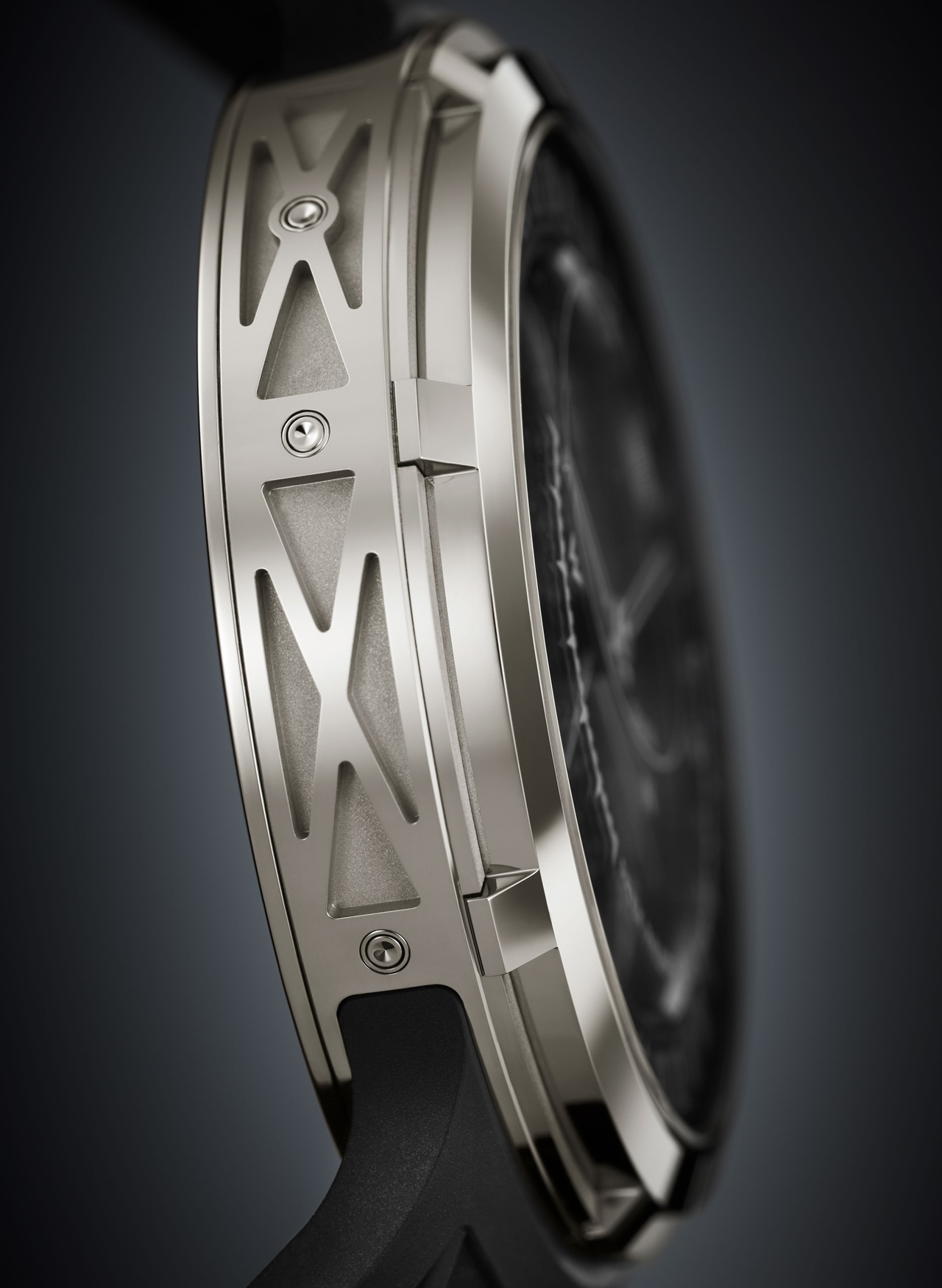 Этот же Х-образный мотив сопровождает не только корпус изделия, но и положен в основу черного ремешка из вулканизированного каучука, что фиксируется при помощи тройной раскладывающейся застежки из 18-каратного белого золота.