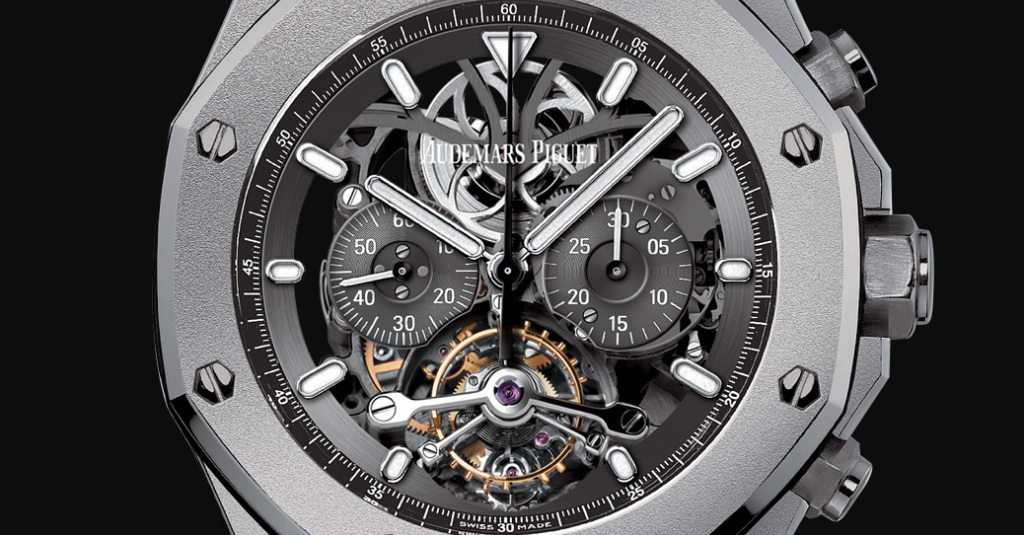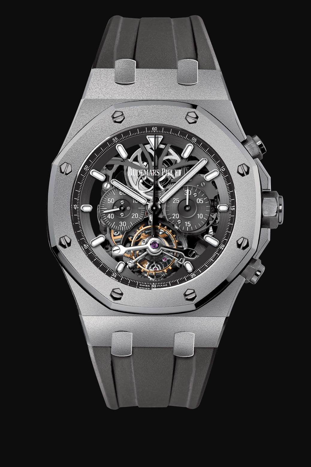 В остальном параметры часов изменений не претерпели — в титановый корпус с пескоструйной обработкой диаметром 44 и толщиной 13.2 мм заключен скелетонизированный мануфактурный механизм с ручным заводом и турбийон-хронографом под индексом AP 2936.