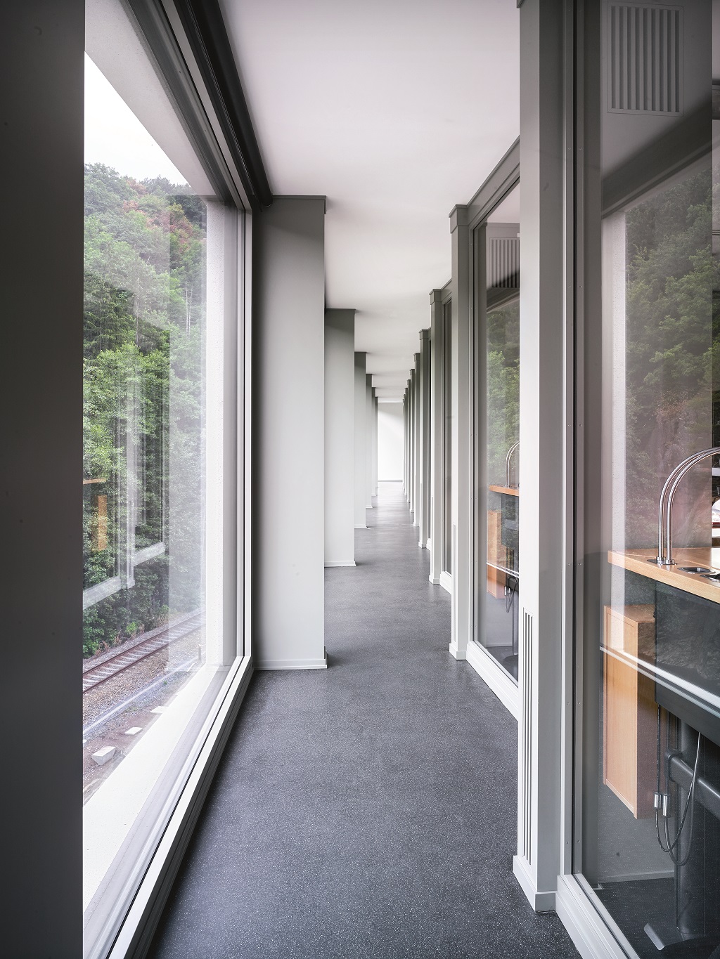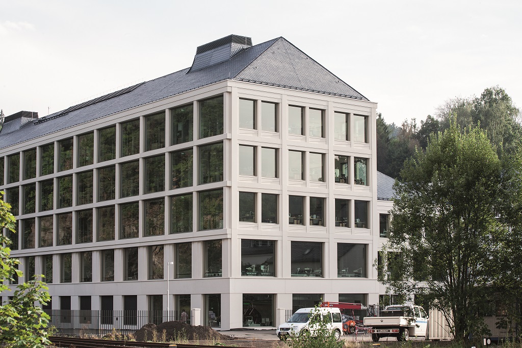 Благодаря светлому и четко структурированному фасаду комплекс из двух корпусов гармонично вписывается в историческую архитектурную среду. Слегка наклоненные широкоформатные окна обеспечивают хорошее освещение на рабочих местах.