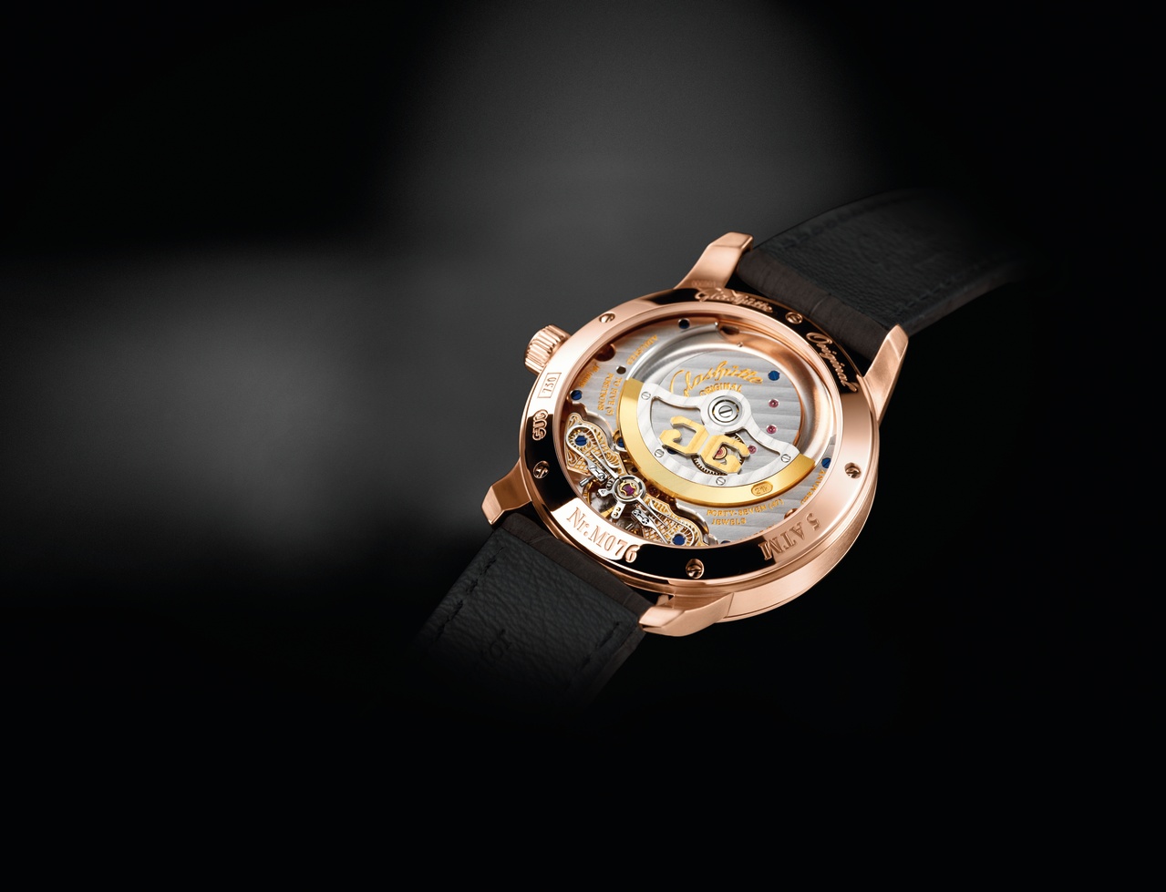 Прозрачное стекло задней крышки корпуса открывает вид на мануфактурный калибр с автоподзаводом 90-02 (диаметр — 32.6 мм, высота — 7 мм, 47 камней, частота баланса — 28’800 пк/ч, запас хода — 42 ч), воплощающий все богатство традиций саксонской часовой школы, чего только стоит, например, гравированный мост баланса с двойной тонкой регулировкой типа «лебединая шея».