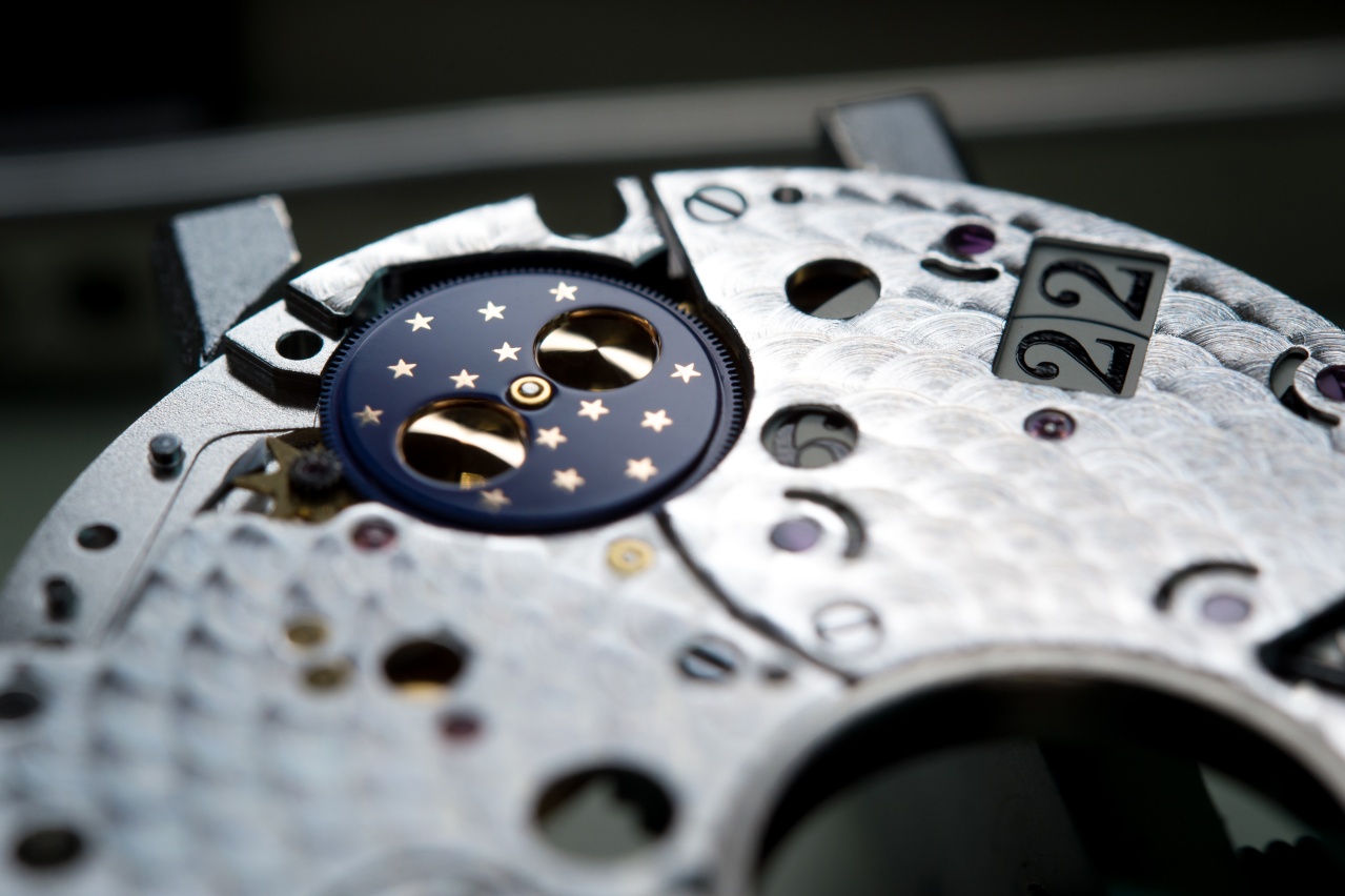 Наконец, марка предлагает полюбоваться дисковым указателем лунных фаз, расположенным с циферблатной стороны механизма, на которым с высочайшим мастерством изображены две золотые Луны в окружении золотистых звезд.