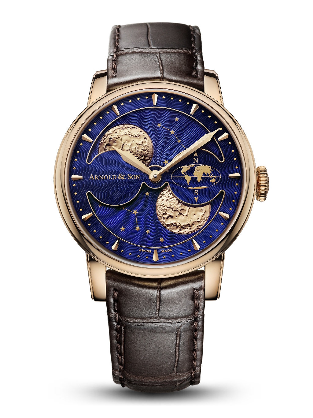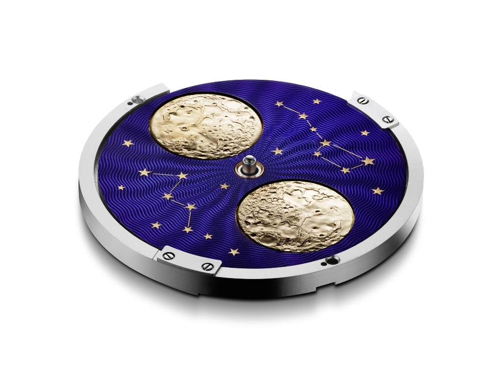 В аналогичной технике выполнен и поворотный диск лунных фаз диаметром 29 мм, на котором два рельефных изображения Луны (диаметр — 11.2 мм) и окружающих звезд сформированы из золота.