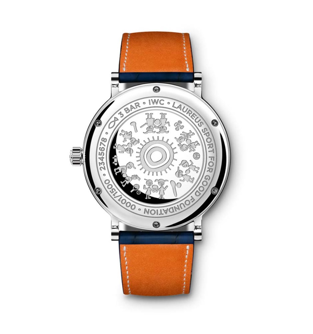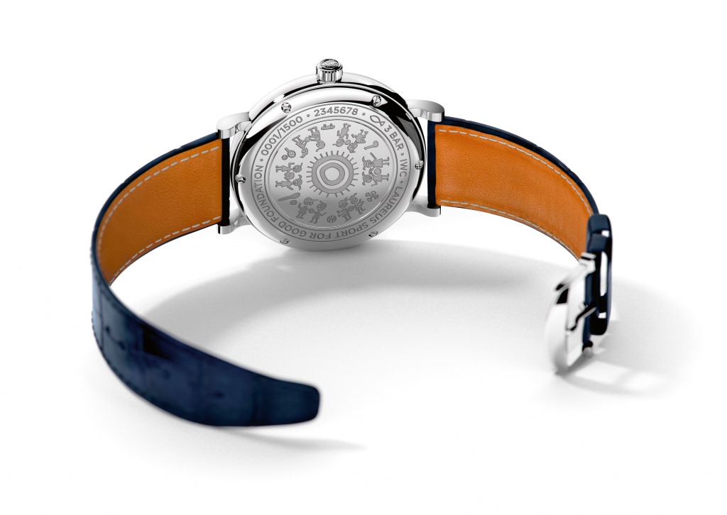 Помимо циферблата синего цвета, характерным отличием часов специальных серий Laureus является особая гравировка на задней крышке — каждый год IWC проводит конкурс на лучший рисунок среди детей и подростков, вовлеченных в проекты этой благотворительной организации.