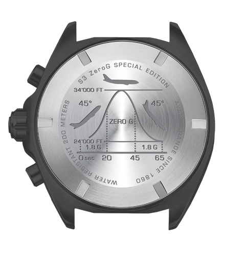 На задней крышке часов выгравирована диаграмма взлета самолета, который движется под углом 45°, которая напомнит пассажирам об уникальном эксперименте, участниками которого они стали.