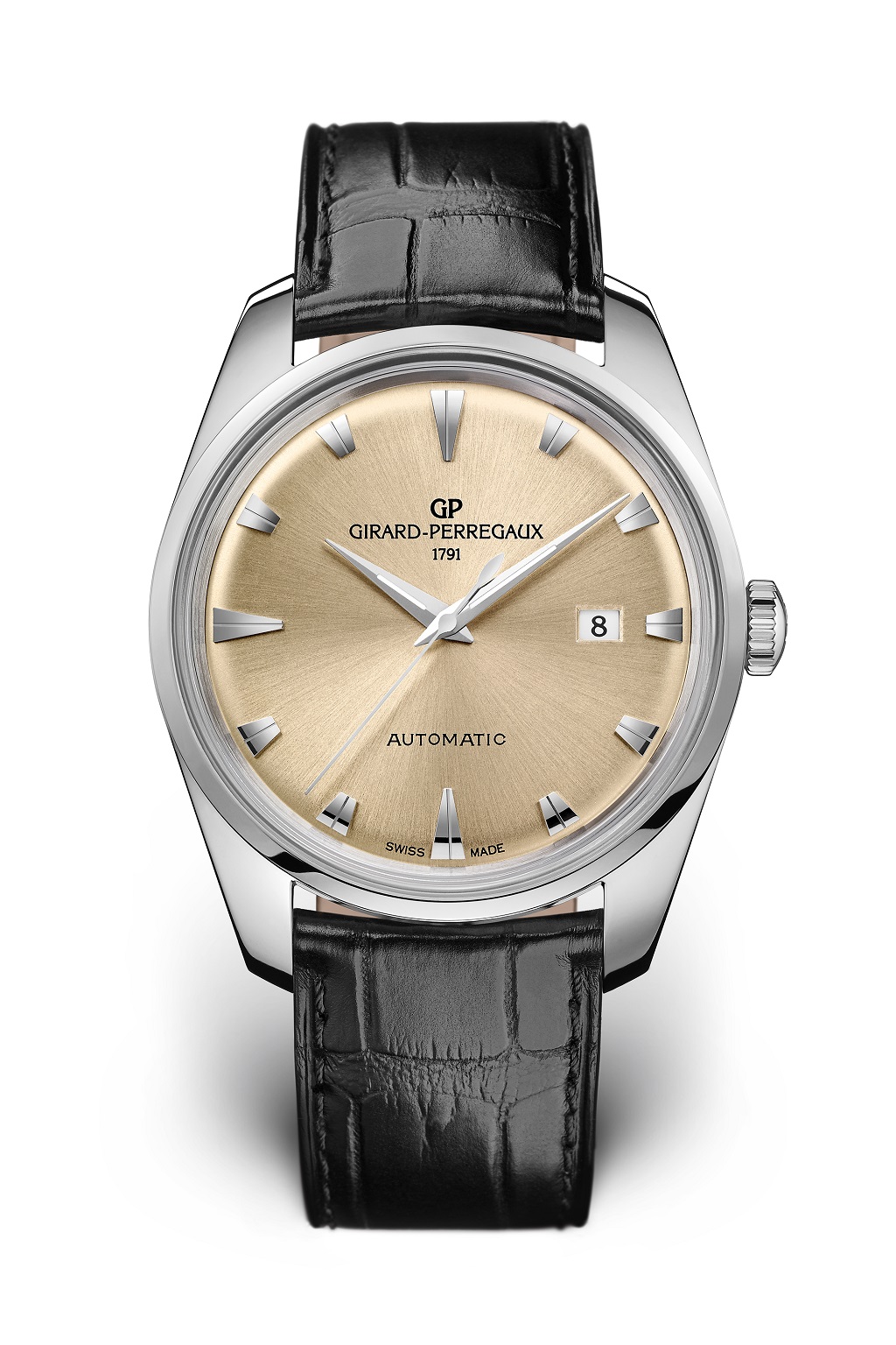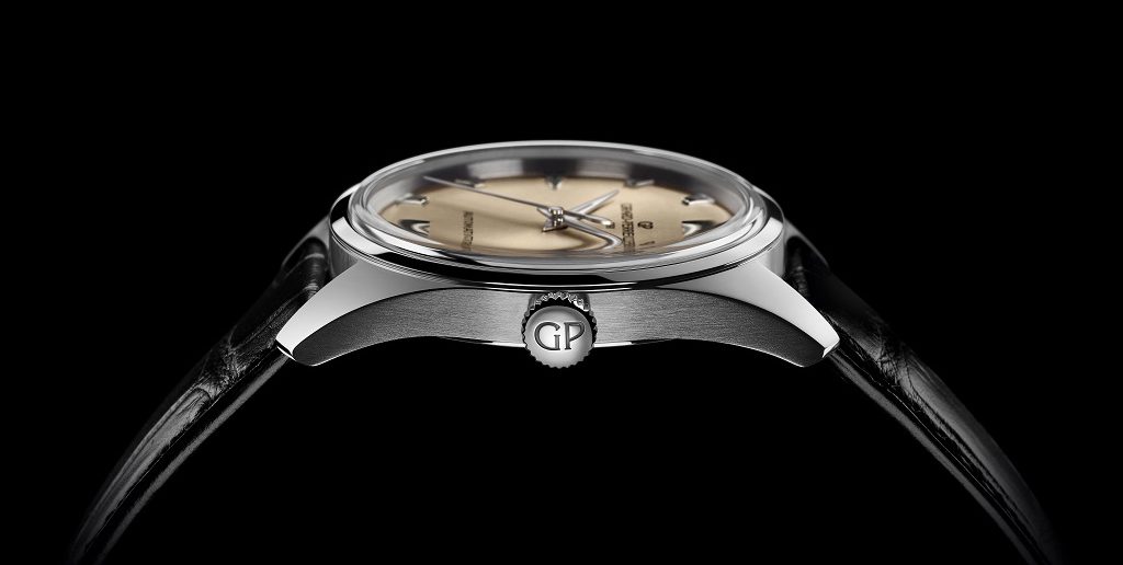 Стеклянная коробка, циферблат цвета шампанского с ретро-эффектом, мечевидные стрелки с люминофором и накладные часовые метки напоминают о богатом наследии Girard-Perregaux.