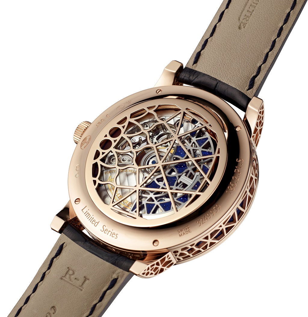 Из этого полудрагоценного камня также выполнен и циферблат, темная синева ночного звездного неба которого проглядывает сквозь ажурную сетку бережно скелетонизированной перламутровой пластины, главное место на которой отведено окну «парящего» минутного турбийона орбитальной конструкции, совершающему полный оборот за 12 часов и служащего указателем текущего часа.