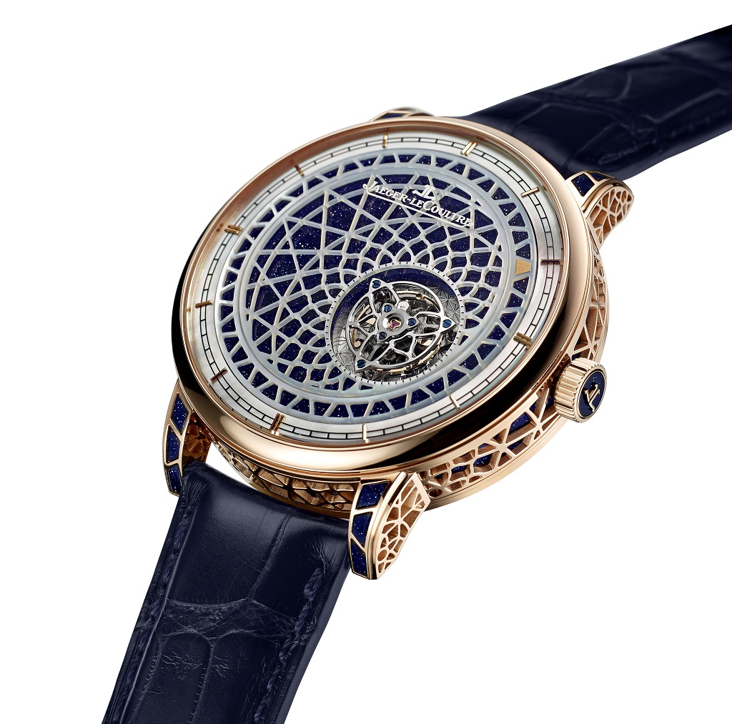 Оборотная сторона часов приоткрывает сетчатый занавес тайны над новым мануфактурным механизмом JLC 941 с 50-часовым запасом хода и ротором автоподзавода, декор которого выдержан в общей стилистике изделия — со скелетонизированием и авантюриновыми фрагментами.