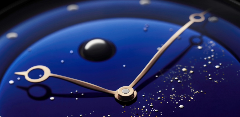 Поверхность циферблата изготовлена из вороненого титана, более крупные элементы Млечного пути выполнены из накладных шариков из белого золота, установленных вручную, а мелкие воронки сформированы лазером и частично позолочены.