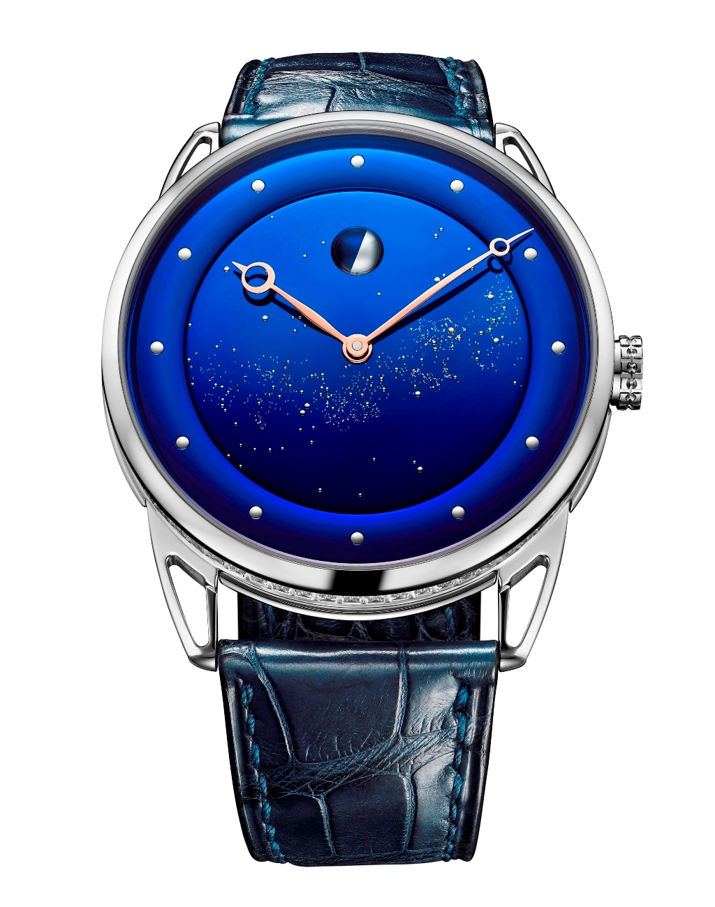 Теперь циферблат модели, выполненной в платиновом корпусе диаметром 44.6 мм и толщиной 11.3 мм, предлагает не просто циферблат, символизирующий темно-синее небо с хаотично расположенными звездочками; ныне последние организованы таким образом, что напоминают звездное скопление, известное как Млечный путь.