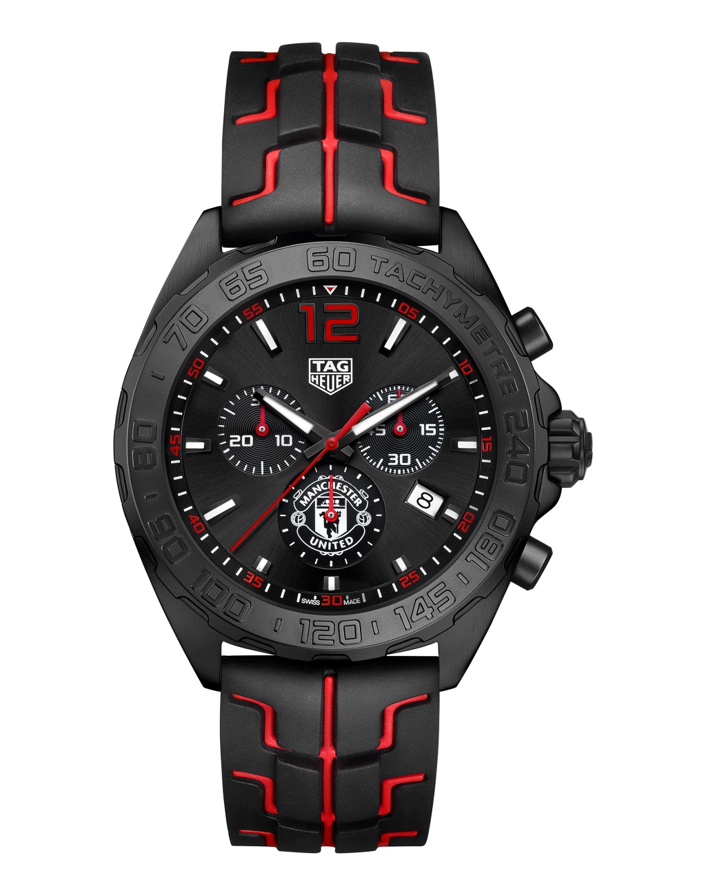 Ярко-красному цвету команды «Манчестер Юнайтед», без сомнения, отведена главная роль: логотип клуба на отметке «9 часов», логотип TAG Heuer на отметке «12 часов» на безеле, часовая, минутная и центральная секундная стрелки хронографа, ремешок из кожи аллигатора красного цвета…