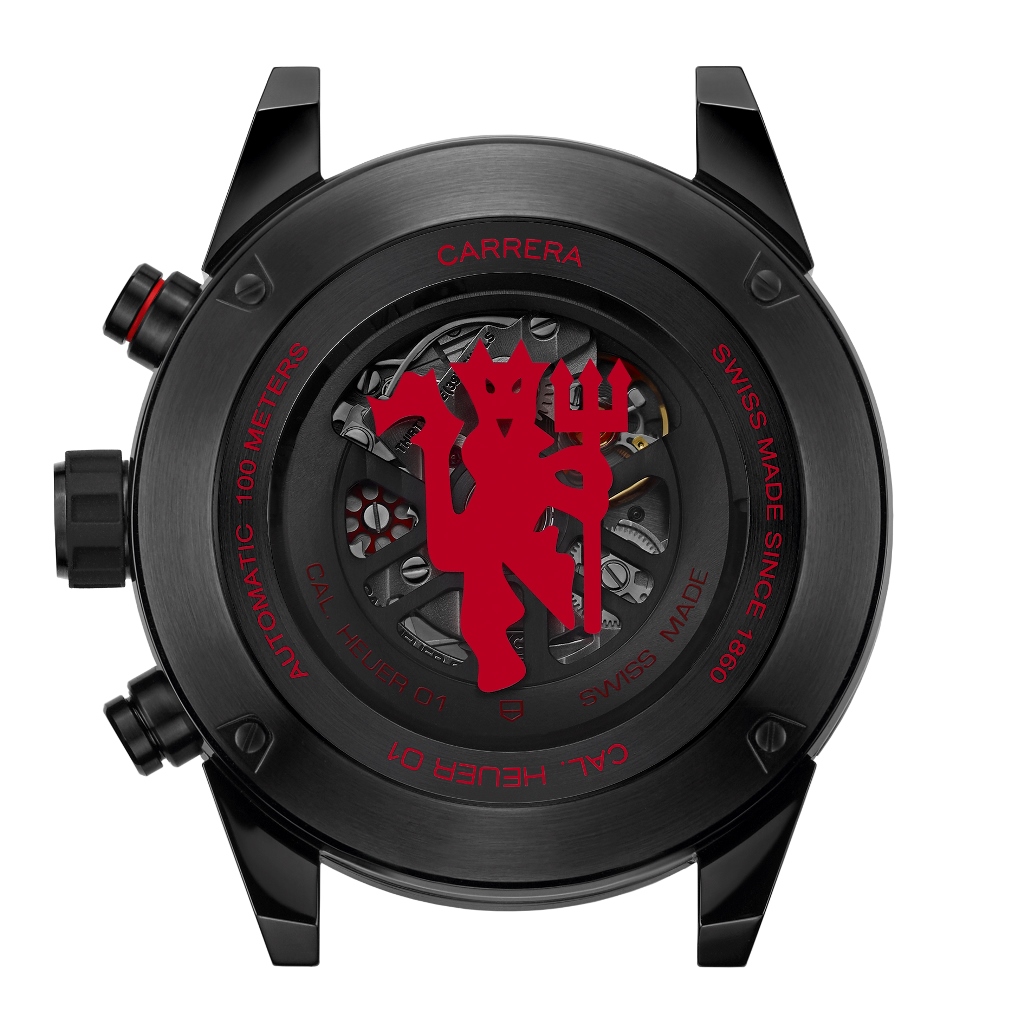 Скелетонизированный циферблат черного цвета и задняя крышка с сапфировым стеклом, на котором размещен символ клуба (красный дьявол), дают возможность оценить заднюю сторону автоматического механизма хронографа Heuer-01 с 50-часовым запасом хода — там даже колонное колесо отсвечивает красным.