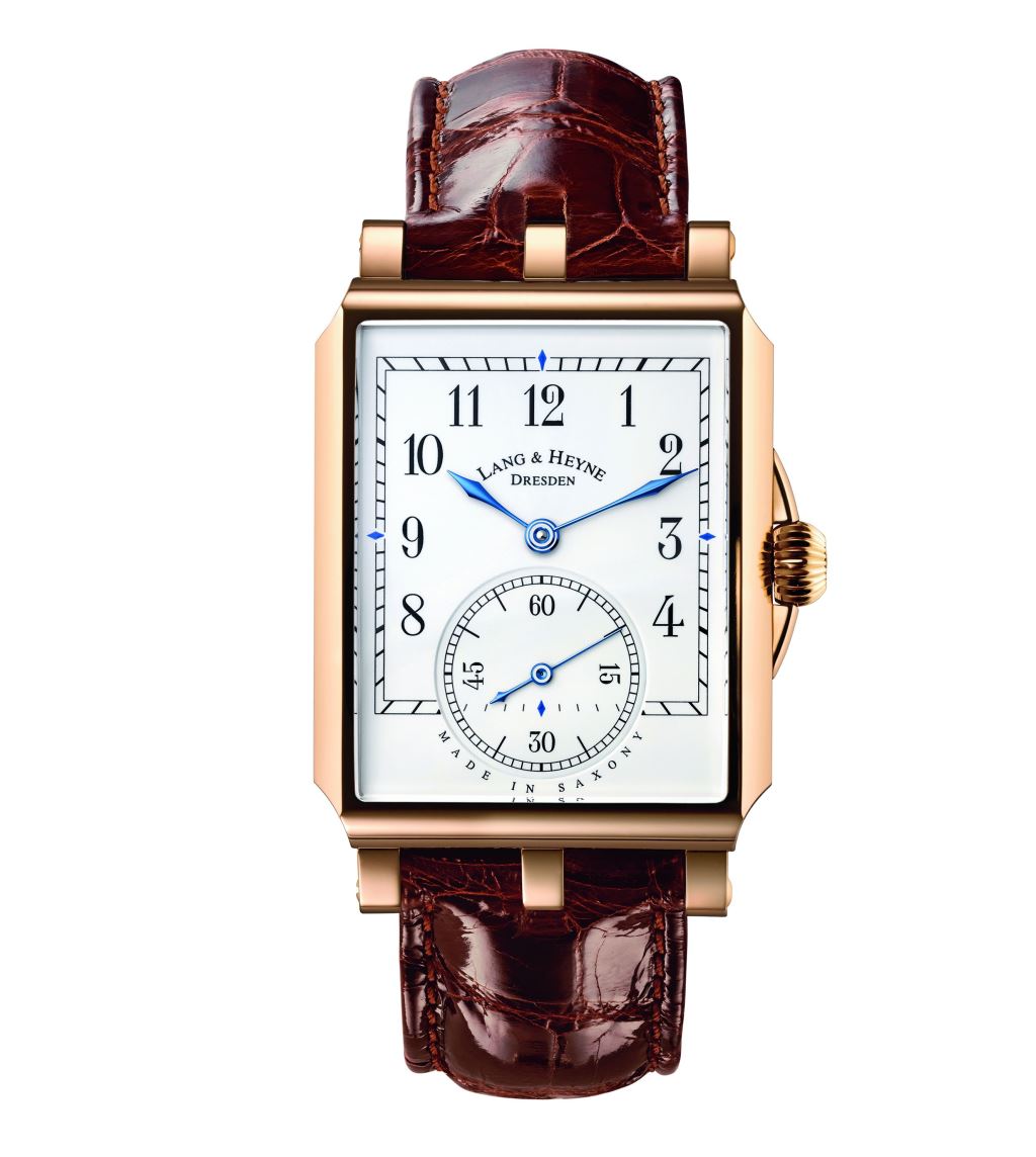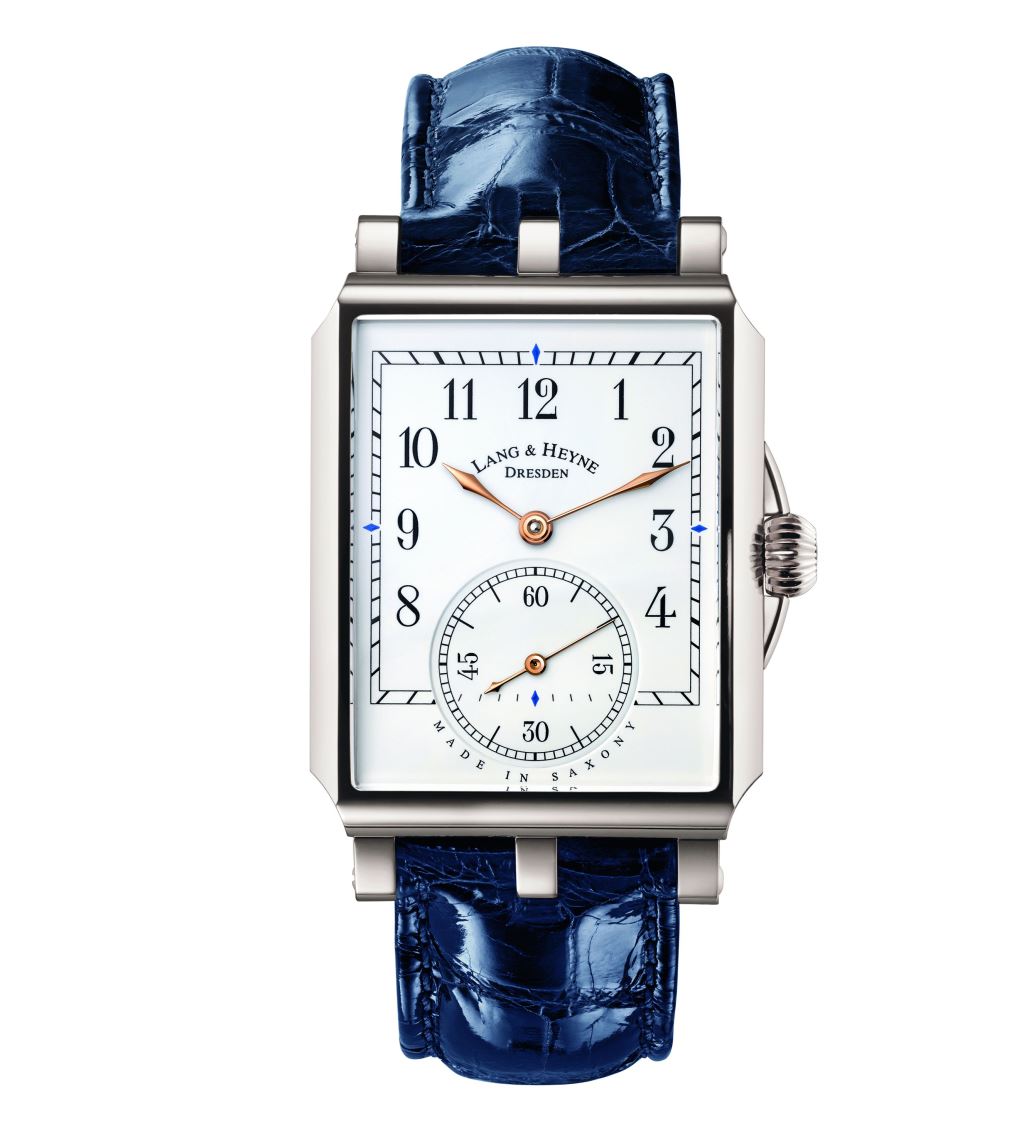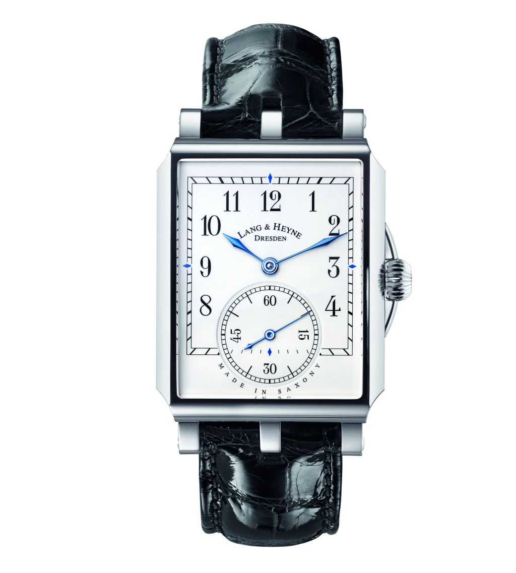 Модель оснащена классическим белым эмалевым циферблатом с минутной разметкой в стиле «железная дорога» и часовыми индексами стиля «арт деко». Значительное место на циферблате занимает секундный указатель, смещенный в положение «6 часов» и опоясанный гордой надписью «Сделано в Саксонии» внизу.