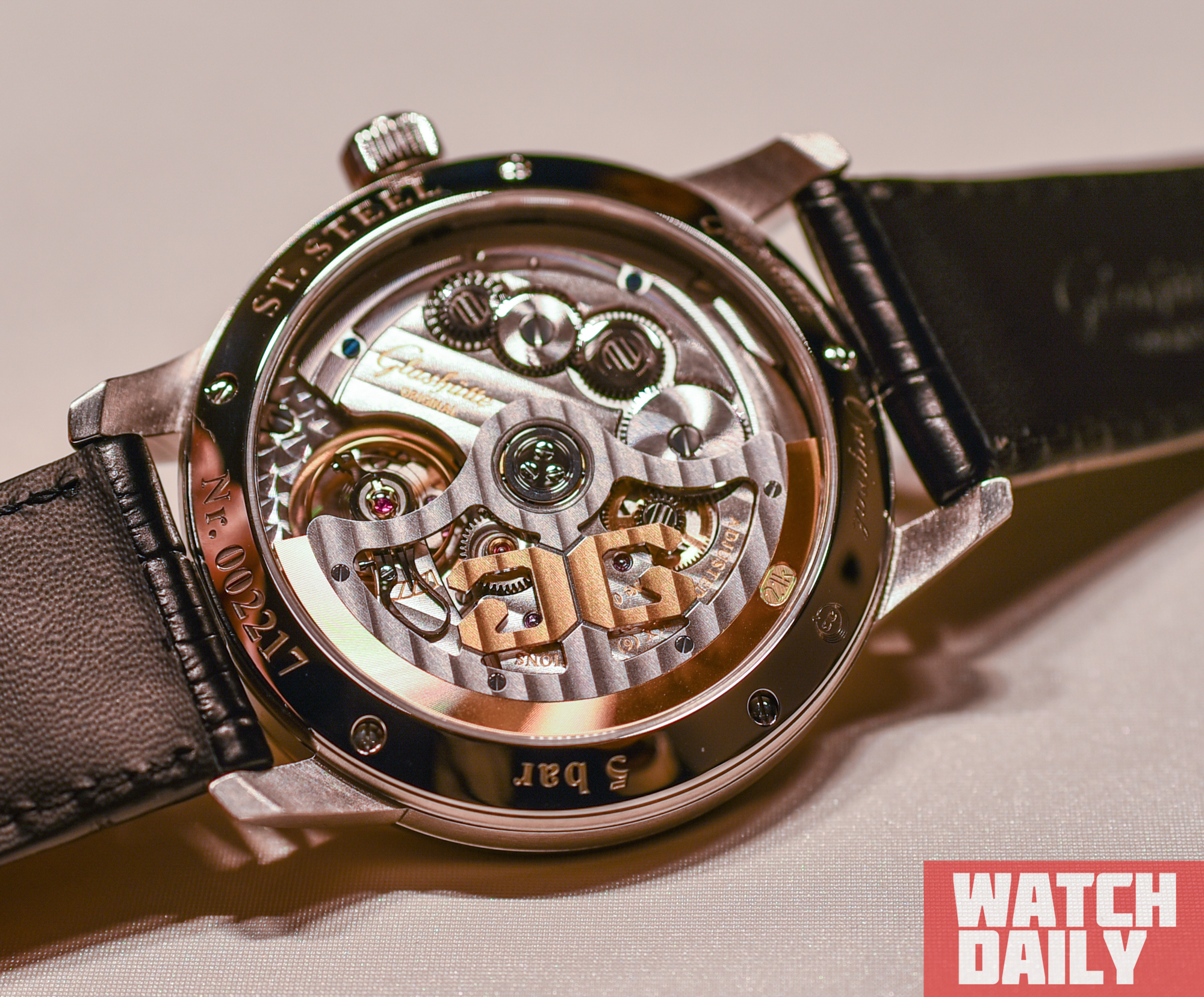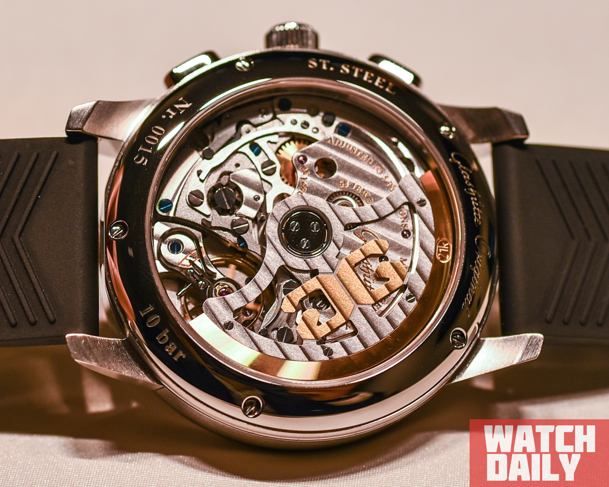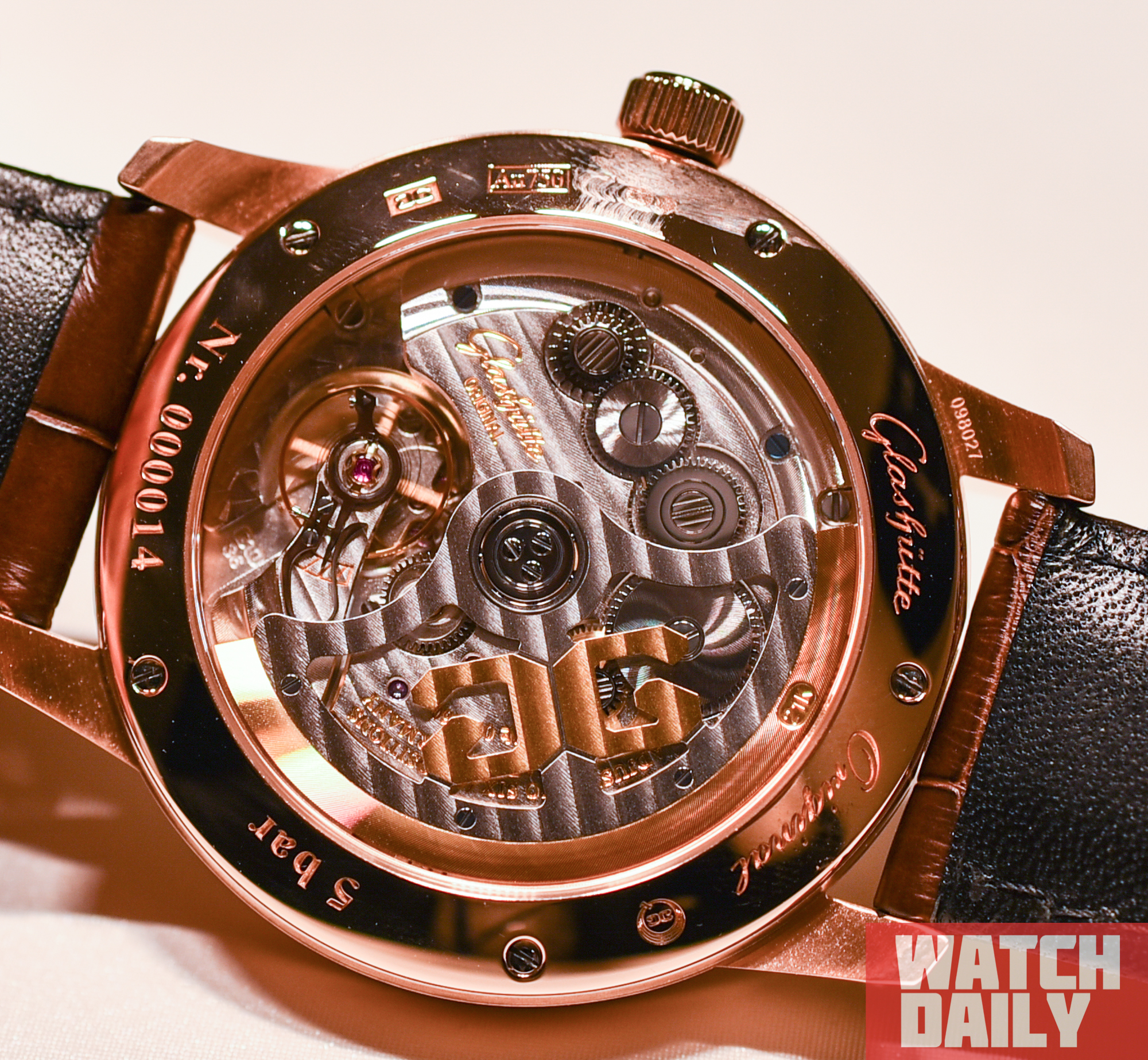 Разумеется, что через прозрачное стекло задней крышки корпуса во всей красе предстает Calibre 36-02, в частности его полноформатный ротор с логотипом производителя и периферийной массой из 21-каратного розового золота.