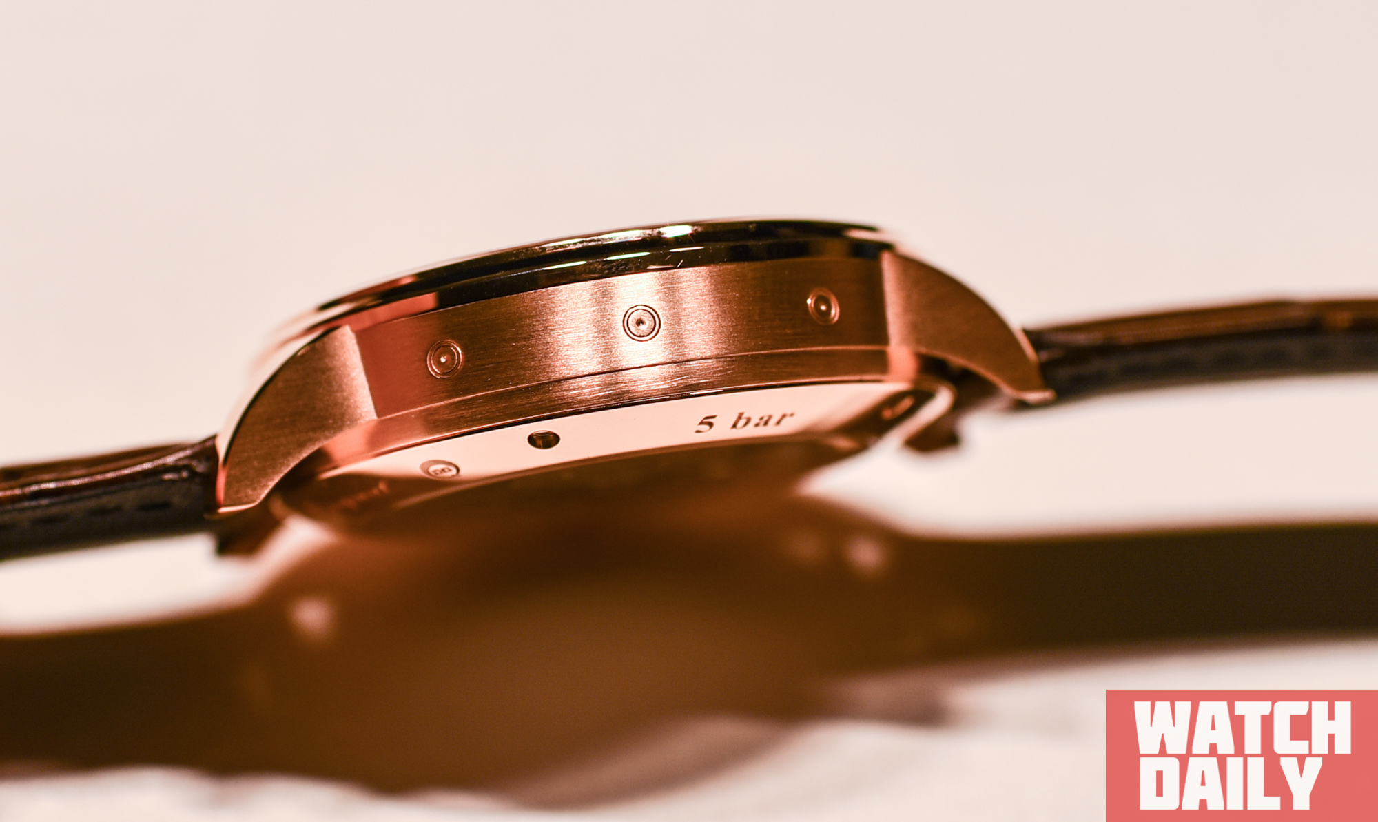 Нержавеющая сталь и 18-каратное розовое золото служат материалом для корпуса диаметром 42 мм и толщиной 12.8 мм, водонепроницаемость которого находится на типичном для линейки уровне WR 50 м.