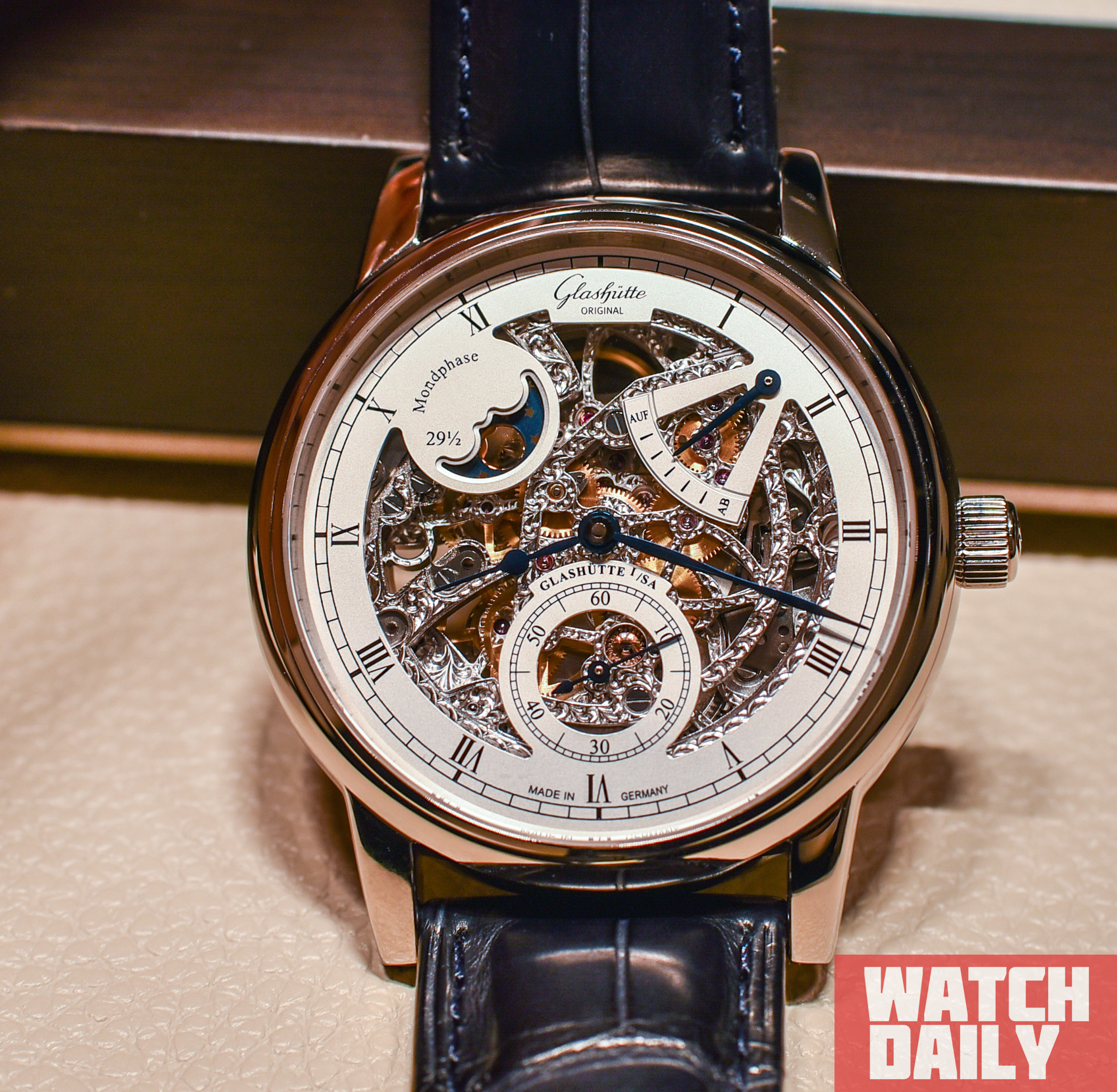 Вторые — изысканное скелетонизированное издание Senator Moon Phase в 42-миллиметровом корпусе из белого золота.