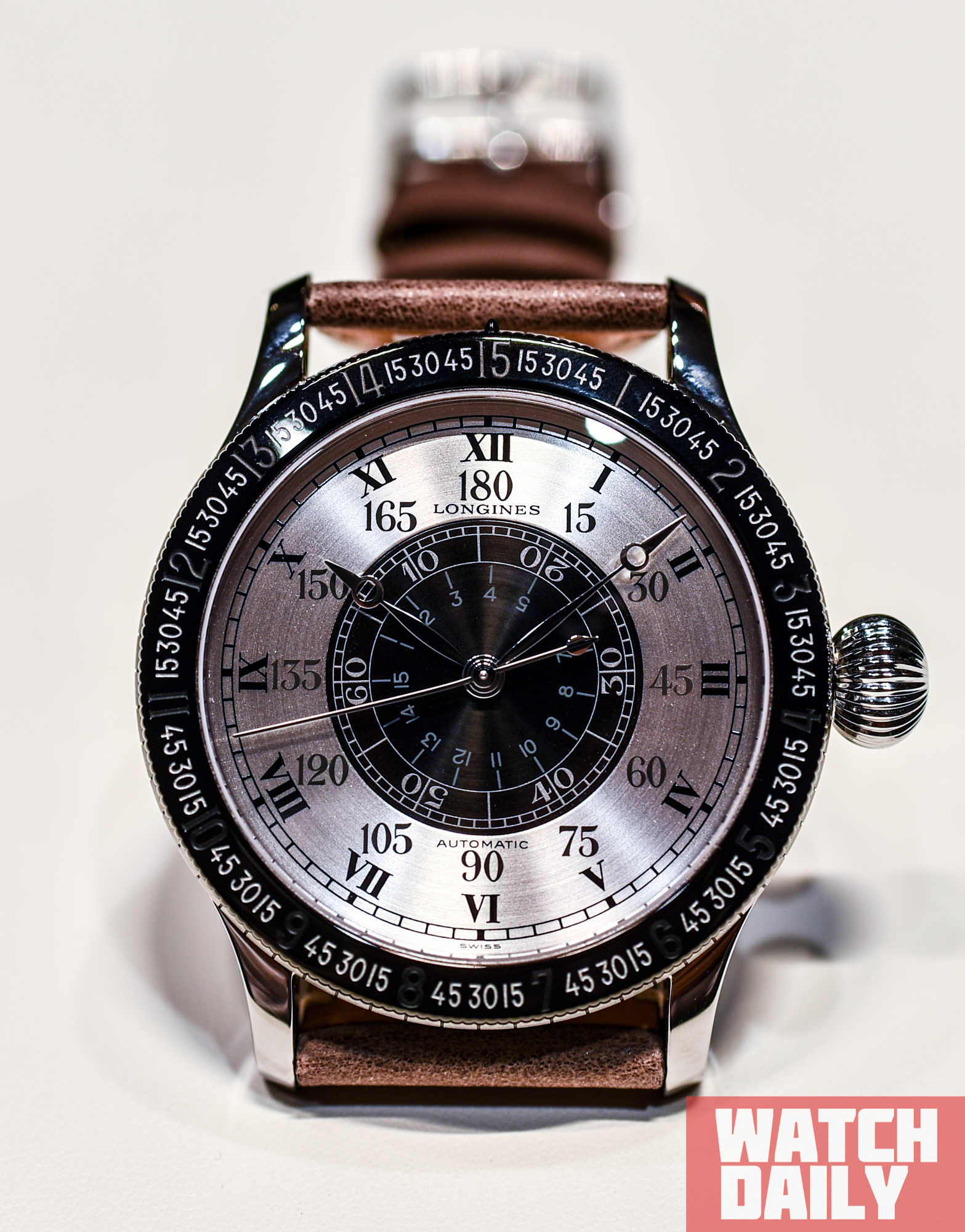 Модель поставляется в комплекте с коричневым кожаным ремешком авиаторского стиля, оснащенного простой застежкой и удлинением, позволяющим носить часы поверх пилотской куртки.