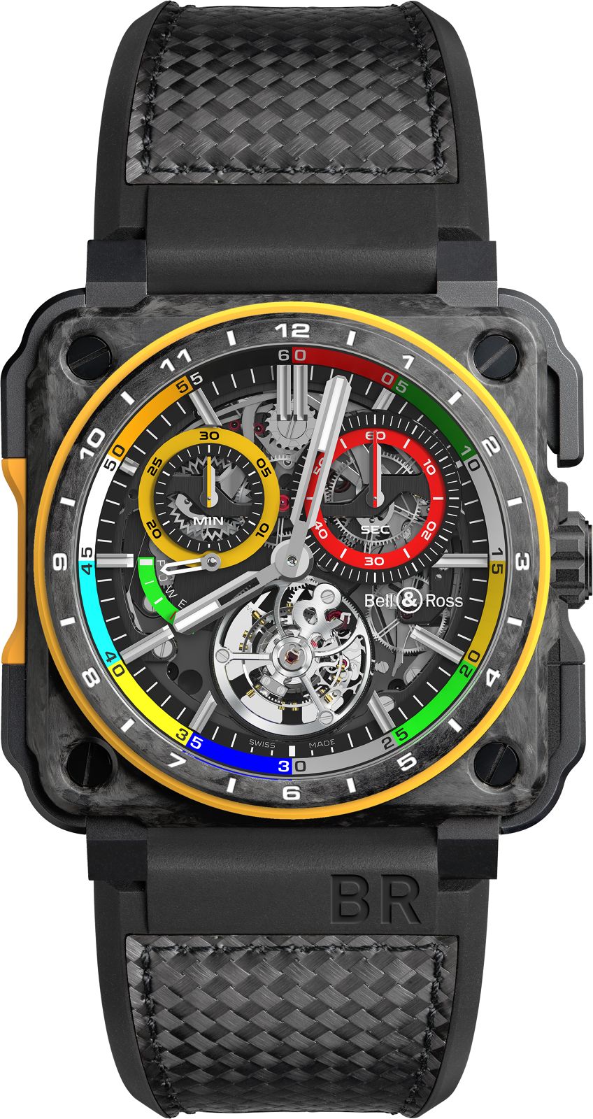 Часы отличает карбоновый циферблат и верхний пушер хронографа из анодированного алюминия желтого цвета, автоматический механизм BR-CAL.301 (базовый — ETA 2894-2) представляет собой хронограф модульной конструкции с запасом хода в 42 часа.