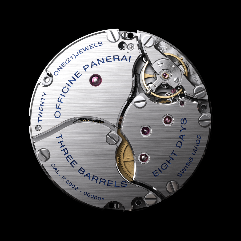 Калибр Panerai P.2002/9 (диаметр – 13¾ линии, высота – 8.2 мм, 23 камня, частота баланса – 28’800 пк/ч, запас хода – 8 дней) является первым заявленным мануфактурным механизмом Panerai, использует принцип ручного завода и схему с тремя заводными барабанами, обеспечивающими 8-дневный запас хода. Базовый механизм появился в 2005 году и обозначен по году начала разработки, при этом он создан по мотивам калибра Angelus 40-х годов.