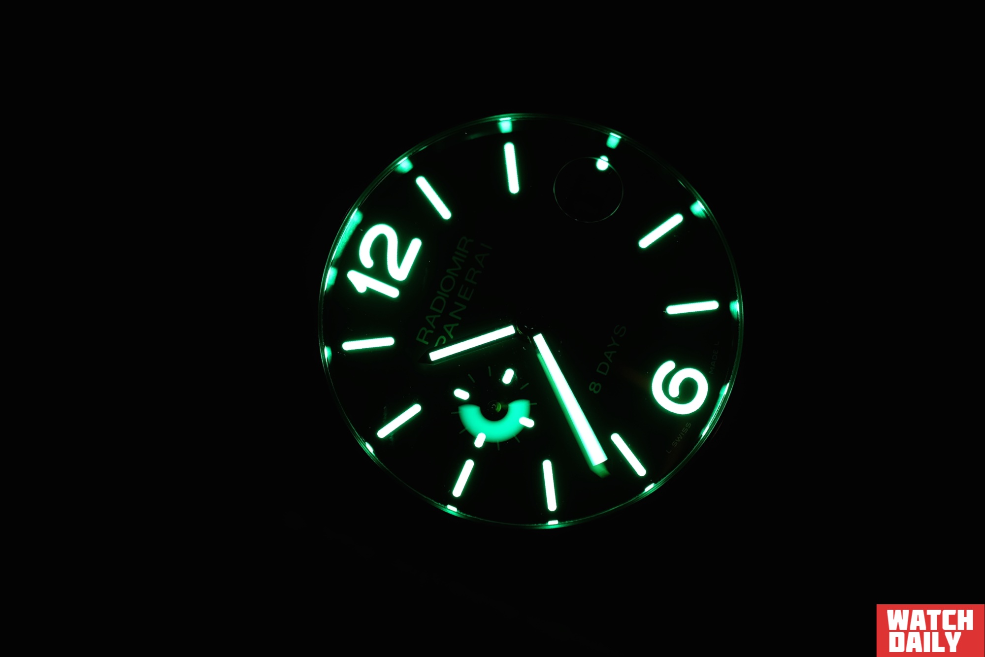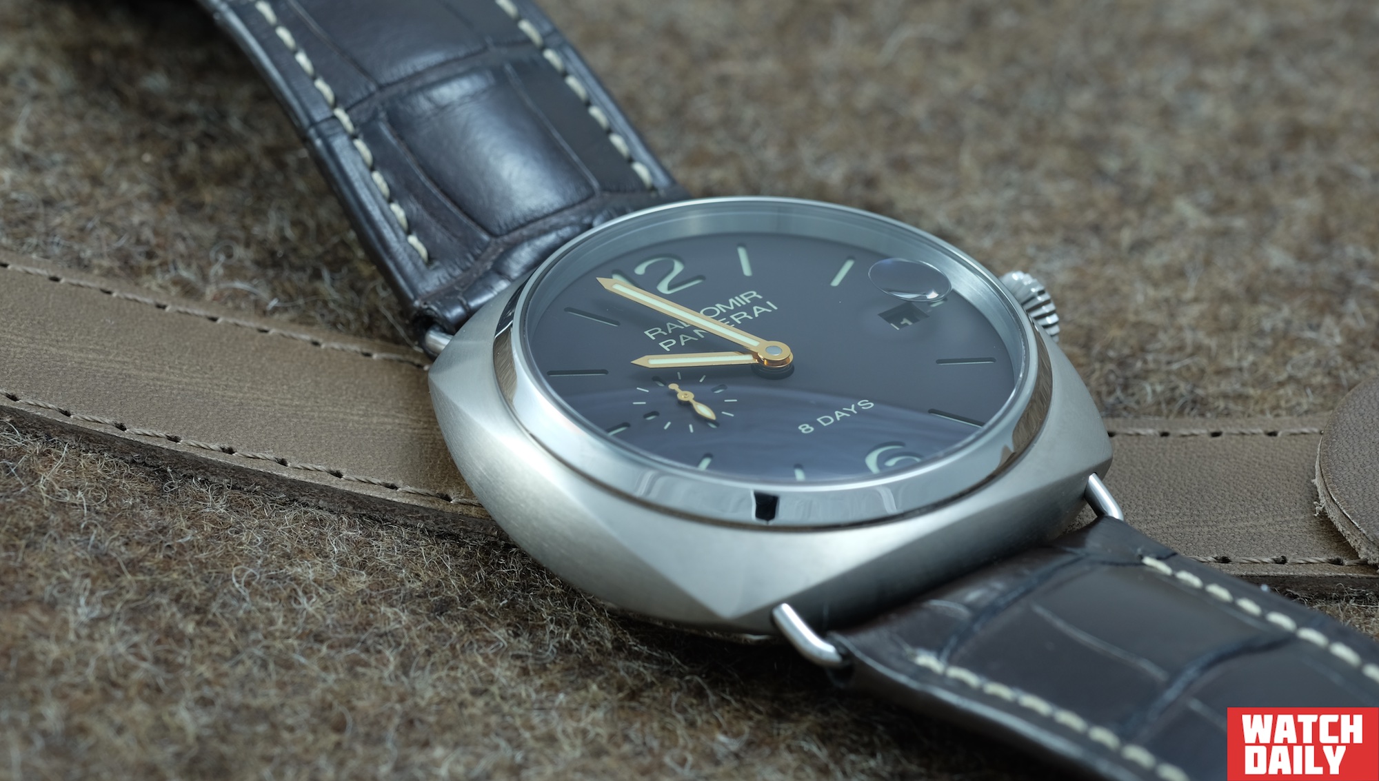 Среди дополнительных функций модели Radiomir 8 Days Titanio несомненно стоит отметить присутствие на «3 часах» прямоугольного окна даты, читаемость которой улучшена посредством увеличительной линзы круглой формы, закрепленной с внутренней стороны стекла.