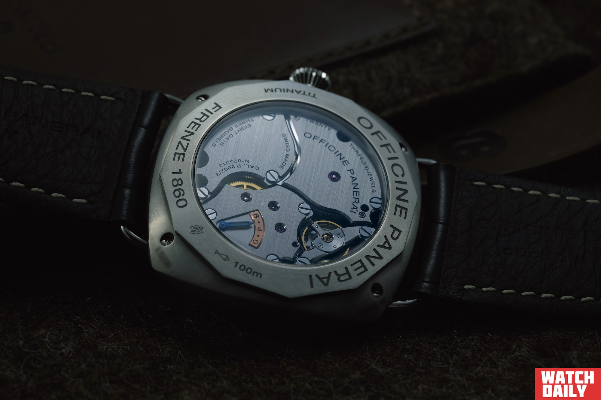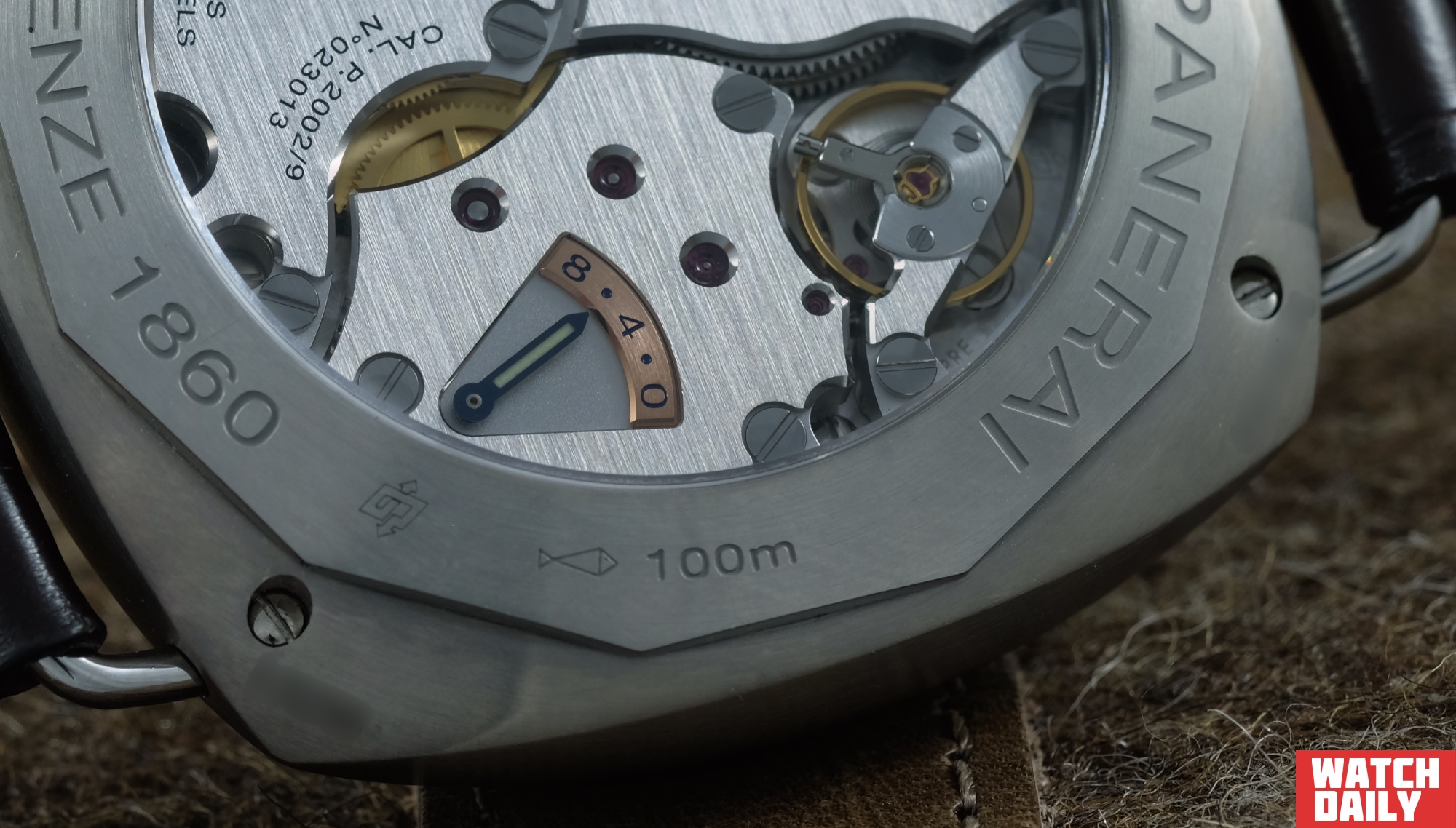 Среди надписей, которые можно обнаружить на циферблате, присутствует обозначение коллекции RADIOMIR PANERAI, а также куда более интригующая 8 DAYS, приоткрывающая занавес тайны над механической начинкой модели, которая, впрочем, прекрасно просматривается за стеклом задней крышки, стоит только перевернуть часы оборотной стороной вверх.