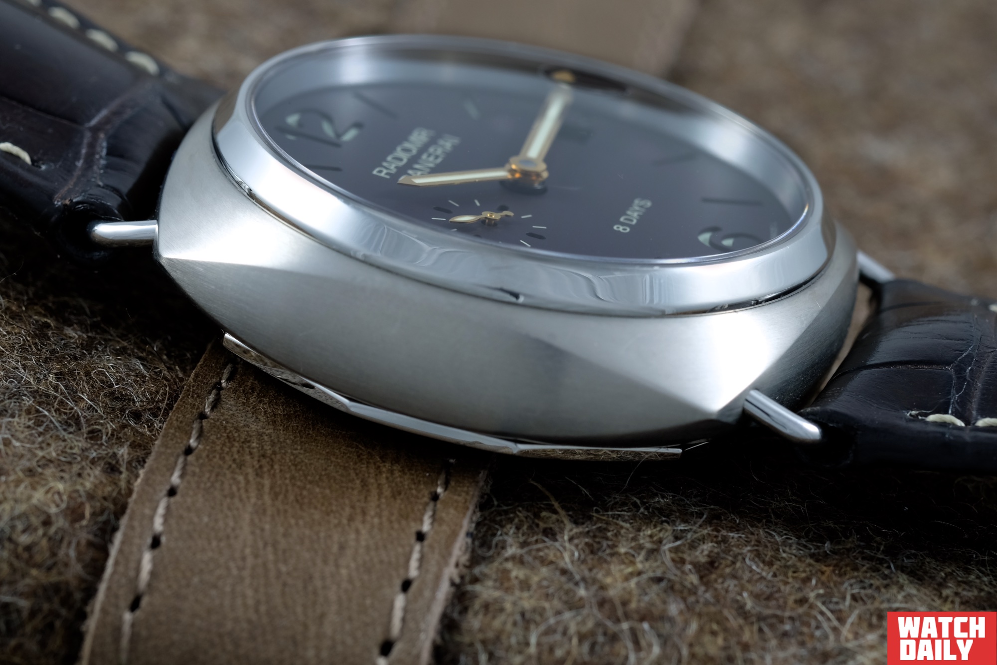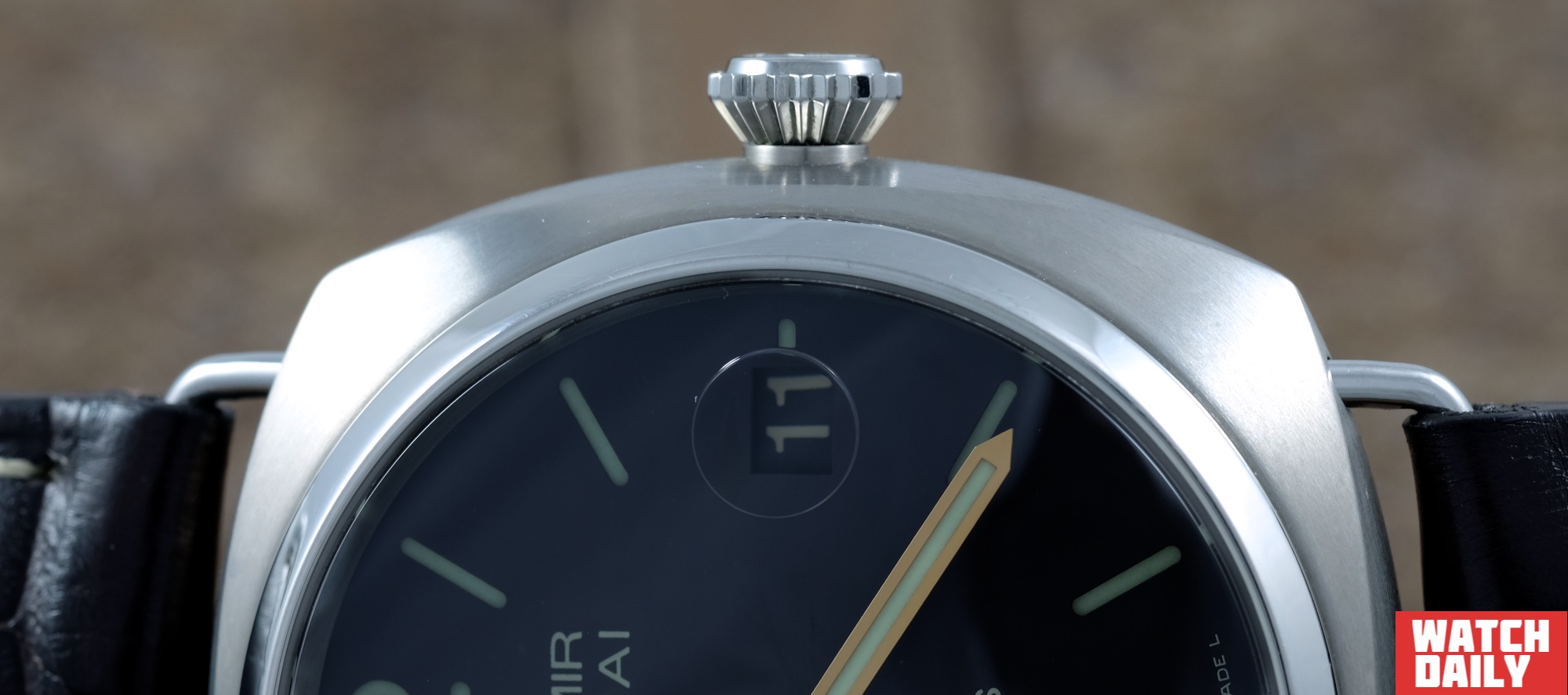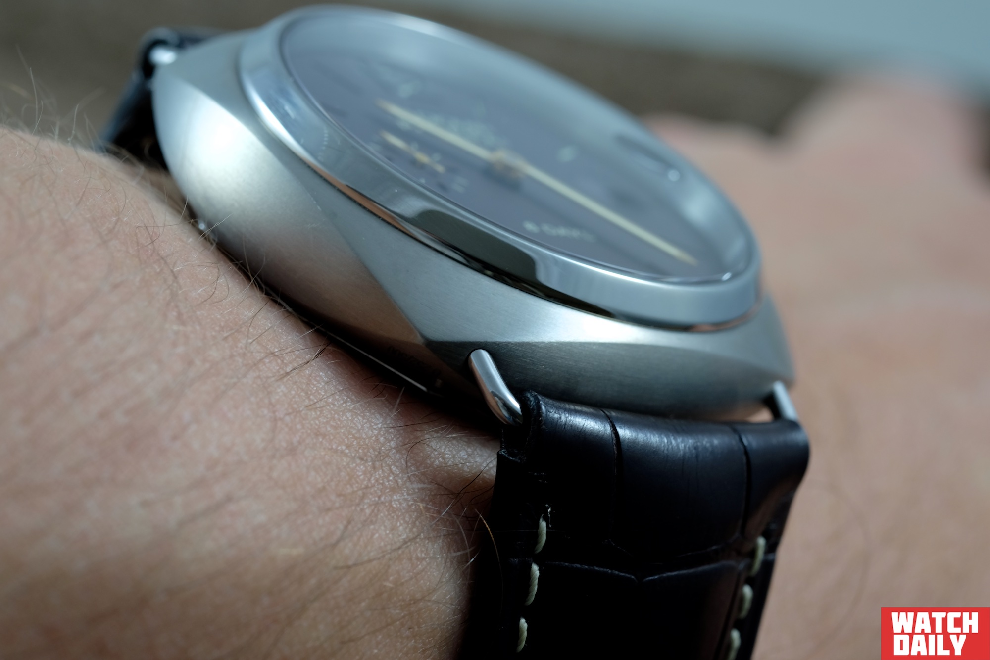 Коническая заводная коронка с характерной накаткой и проволочные скобы крепления ремня также, как и форма корпуса, унаследованы от исторического прототипа Radiomir. Замечу, что последние встроены в корпус под определенным углом таким образом, что являются продолжением верхнего дугообразного излома боковой части корпуса и в тоже самое время снижают высоту точки фиксации ремня по отношению к запястью.