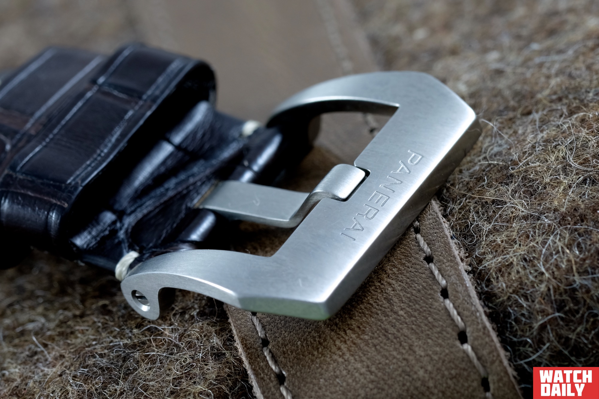 Скоба крепления позволяет оснастить часы довольно широким ремнем, в нашем случае это изделие из кожи аллигатора, светло-коричневого цвета, прошитое нитью бежевого цвета. Ширина у корпуса достигает 27 мм, в месте расположения крупной титановой застежки классического типа со шпеньком – 20 мм. Разумеется, ничто не мешает в данном случае осуществиться традиционной забаве любителей часов Officine Panerai по всему миру – смене ремня на любой, пришедшийся по нраву.