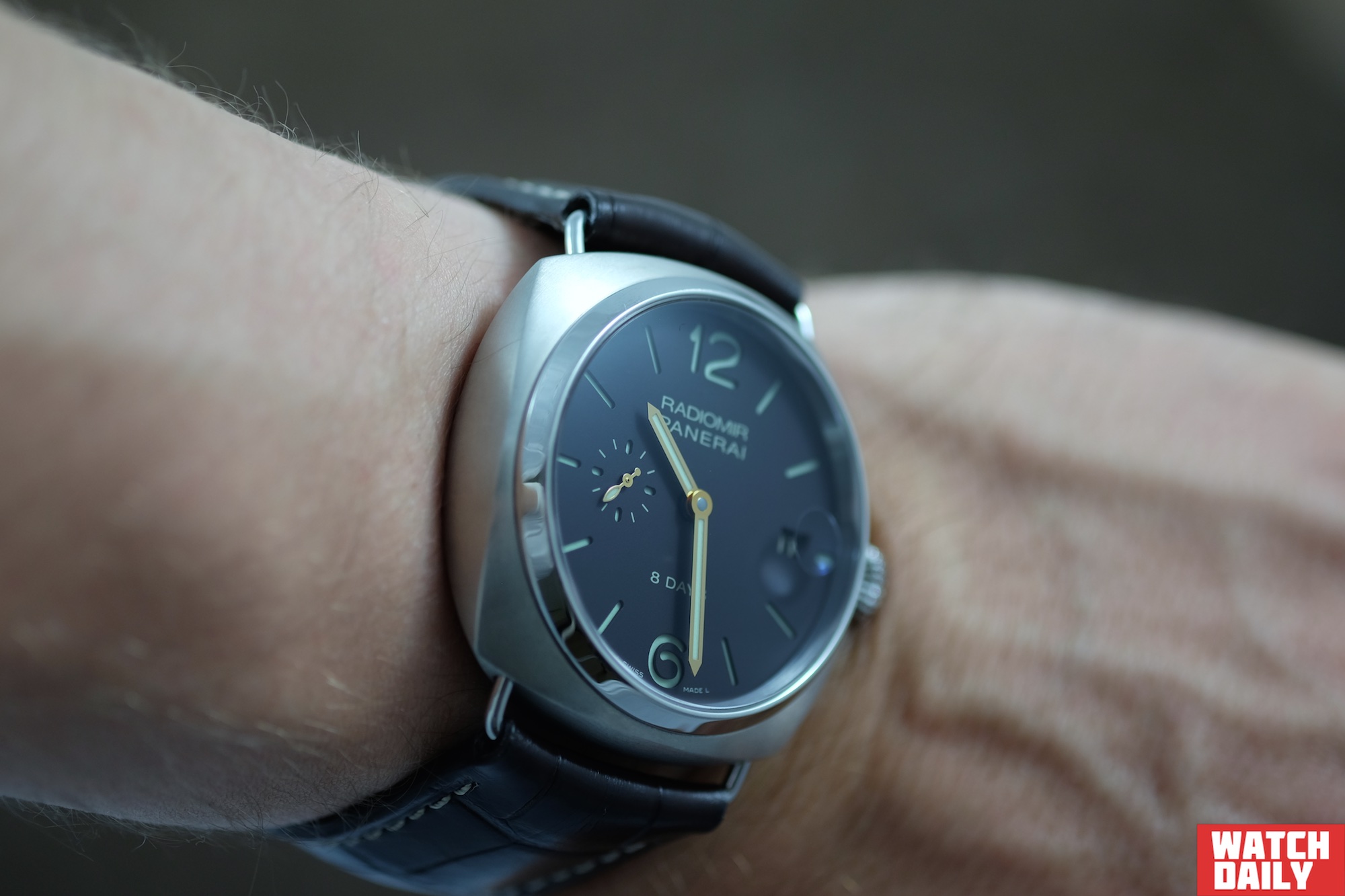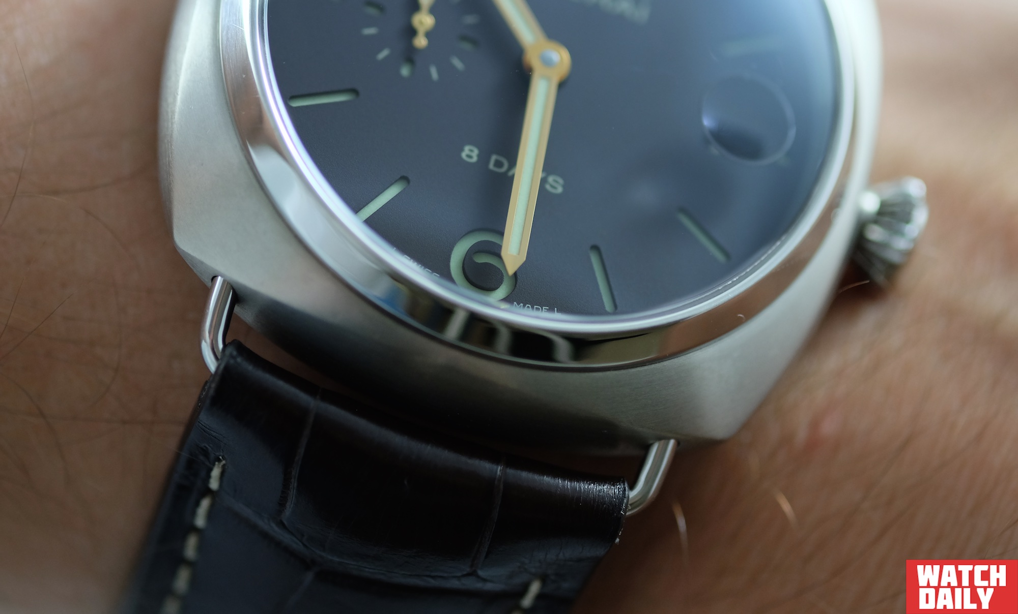 Надо признать, что именно благодаря такому оригинальному способу крепления (скоба выступает лишь на 6 мм от поверхности корпуса), часы Radiomir 8 Days Titanio, несмотря на 45 мм диаметр, вполне комфортно располагаются на запястье, фактически ограничивая свое присутствие на площади чуть более 45 х 45 мм, что было бы крайне затруднительно в случае классических дужек, которые, как показывают результат наших измерений, могут удлинять корпус до 50 мм и более по оси «6 ч – 12 ч».