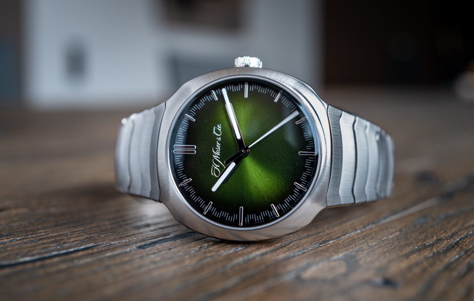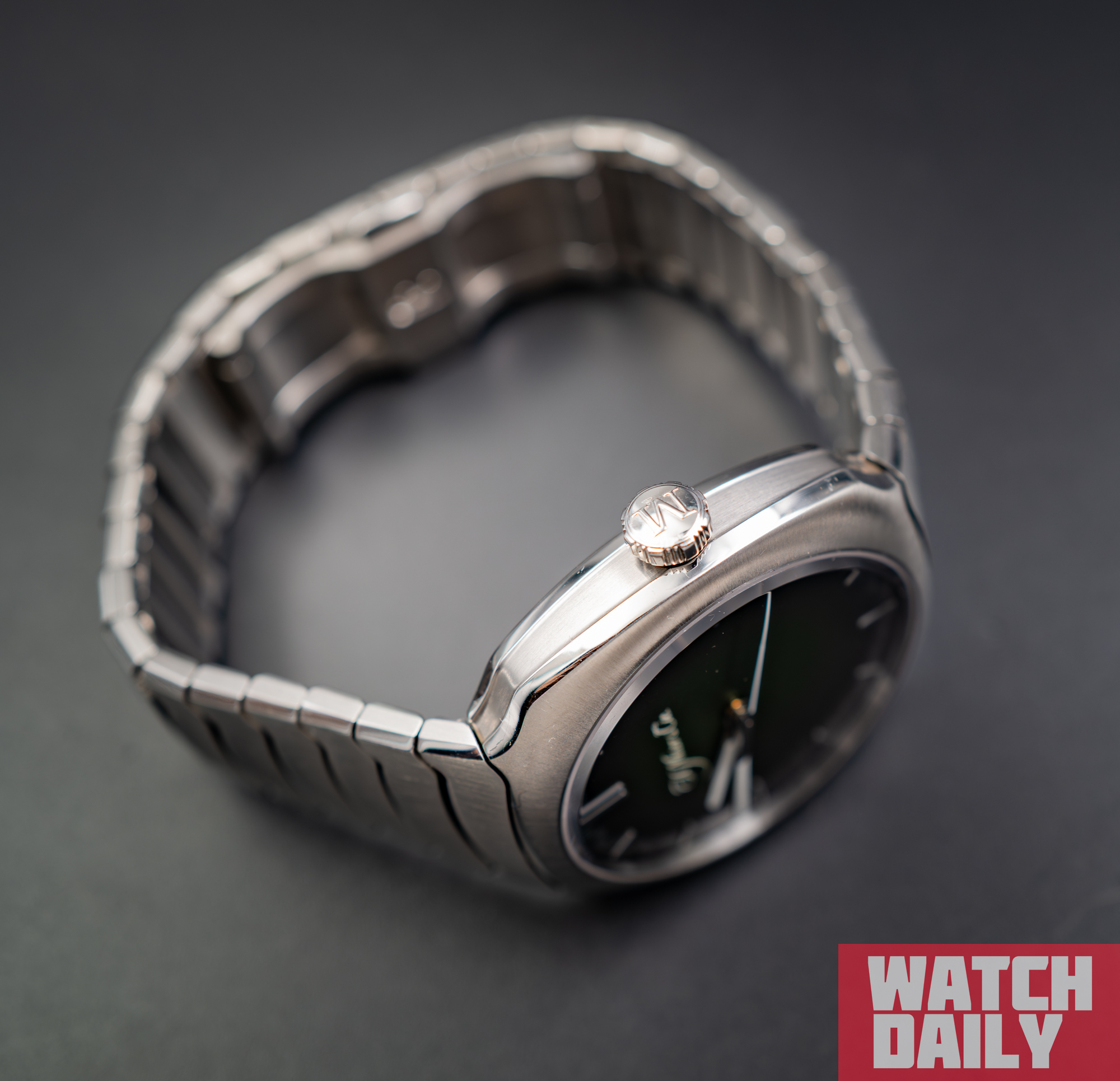 Лицевая сторона корпуса увенчана слегка выпуклым сапфировым стеклом, что открывает вид на циферблатную композицию, состоящую из подчеркнутого тонкой радиальной шлифовкой основания цвета Matrix Green, накладных часовых меток, напечатанной минутной разметки и названия производителя, а также трех центральных указателей оригинального стиля.