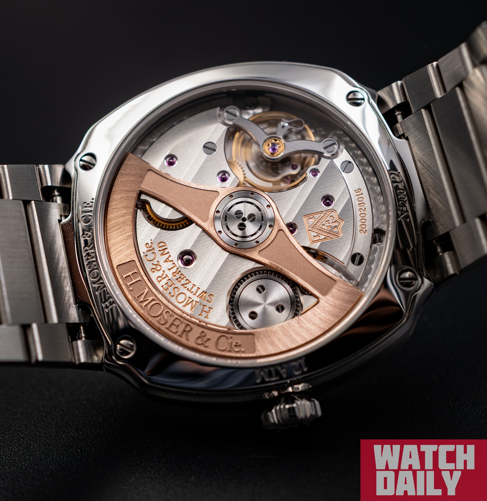 Поступательное движение изогнутого секундного указателя, как и более размеренное — минутного и часового — обеспечивается мануфактурным автоматическим калибром HMC 200 (диаметр — 14 1/4 линий или 32 мм, высота — 5.5 мм, 27 камней, частота баланса — 21’600 пк/ч, запас хода — 72 часа), к ключевым особенностям которого можно отнести использование балансовой спирали Original Straumann Hairspring® и системы двухстороннего автоподзавода на основе храповых «собачек».