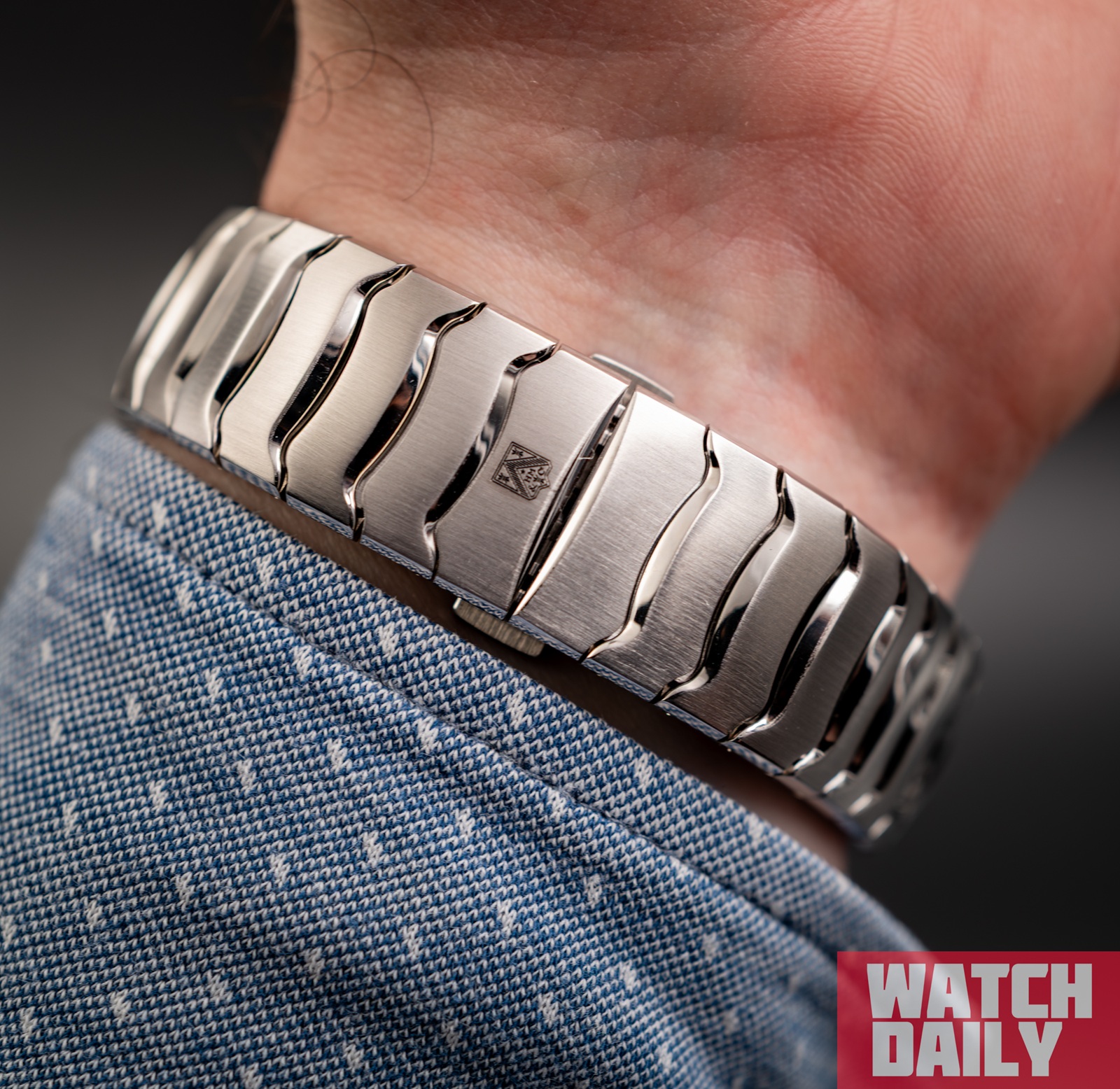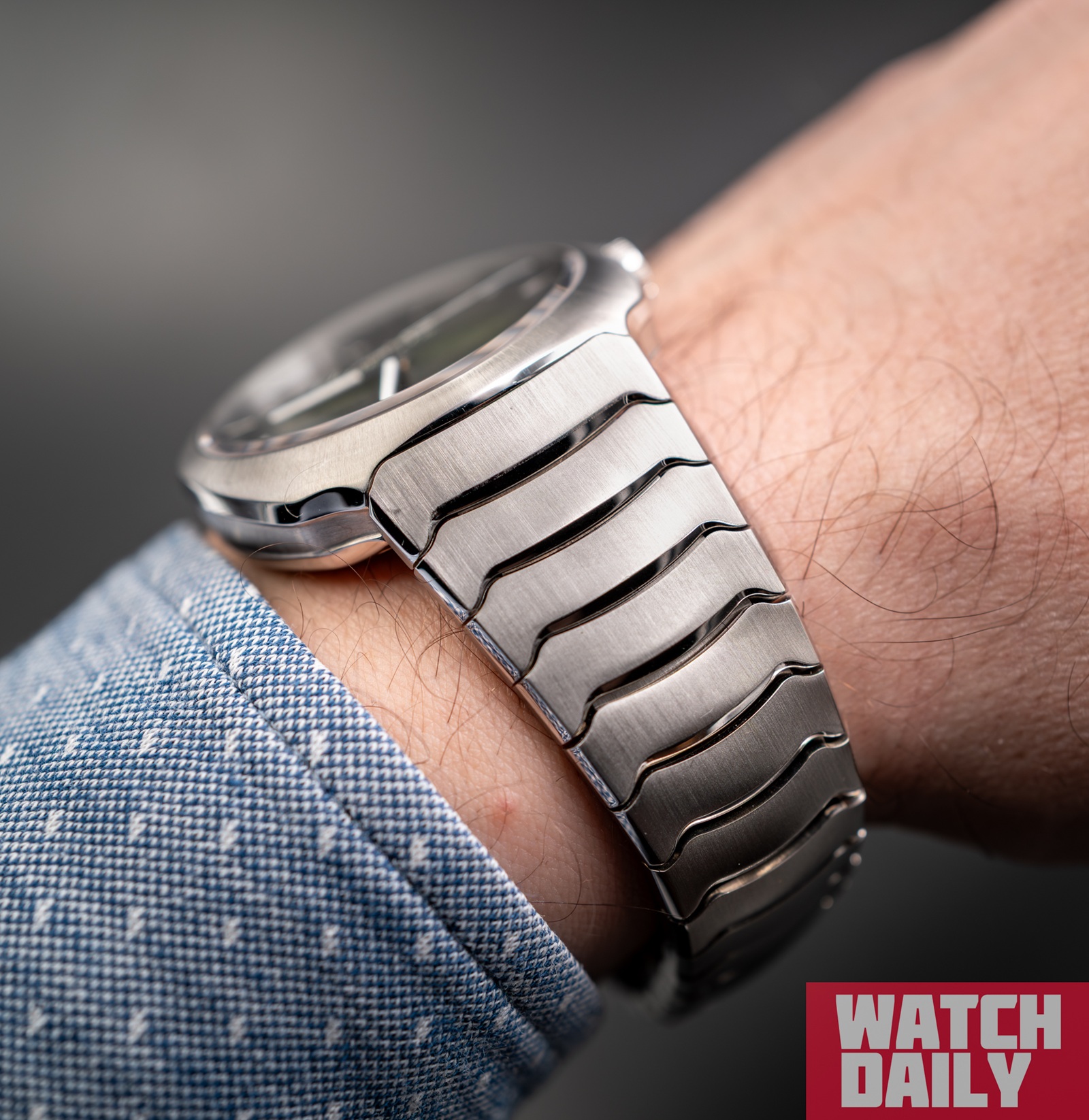 Сужающийся силуэт и удивительная гибкость конструкции обеспечиваются звеньями оригинальной формы, расстояние между которыми плавно меняется в зависимости от степени изгиба, а отделка демонстрирует элегантное сочетание линейного сатинирования с полированными торцами и междурядьями.