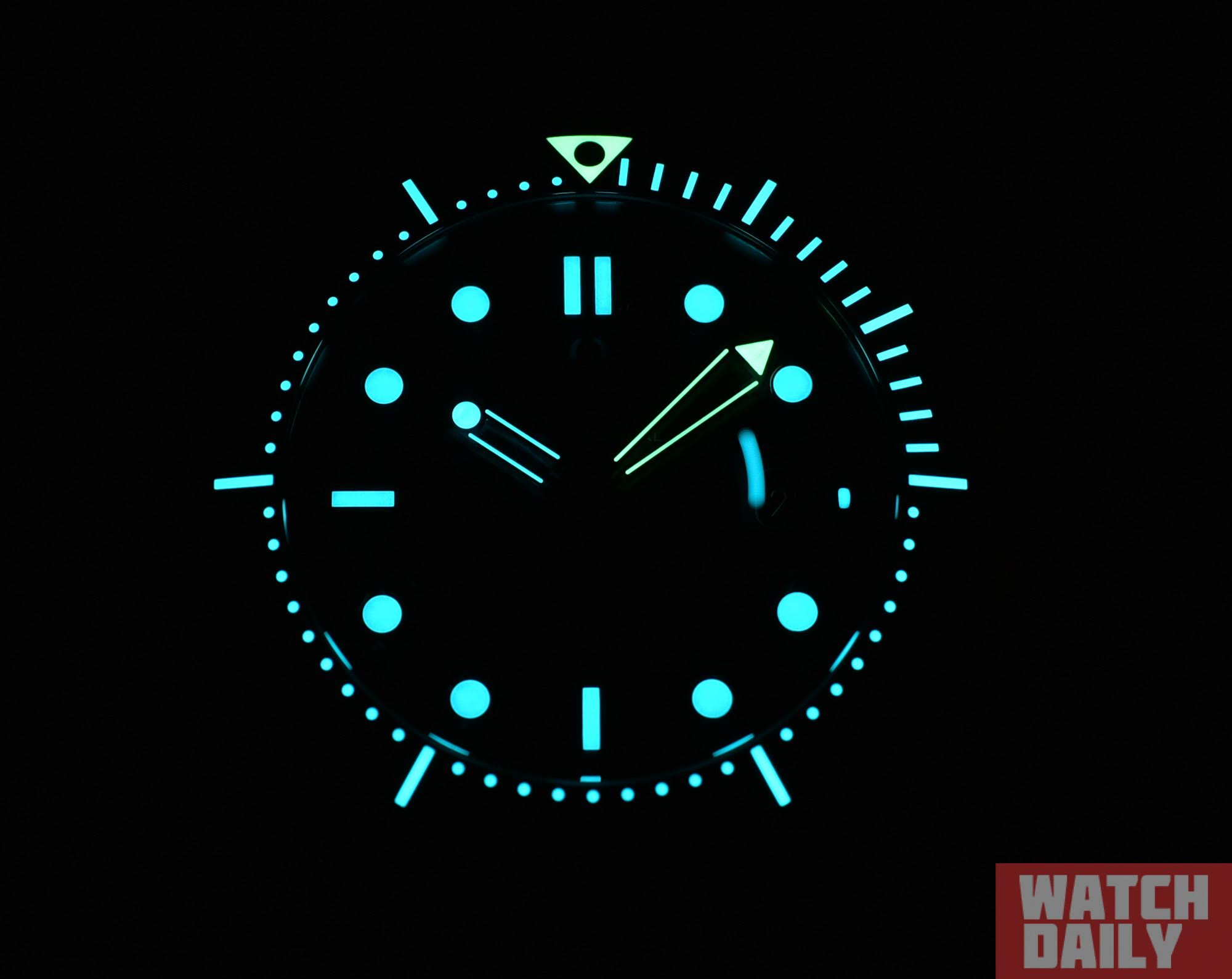 При всем при этом они предлагают удобную индикацию текущего времени, сочетая крупные накладные часовые метки и фирменные скелетонизированные стрелки с обильным присутствием люминесцентного состава Super-LumiNova (не забываем, что мы имеем дело с часами для подводного плавания).
