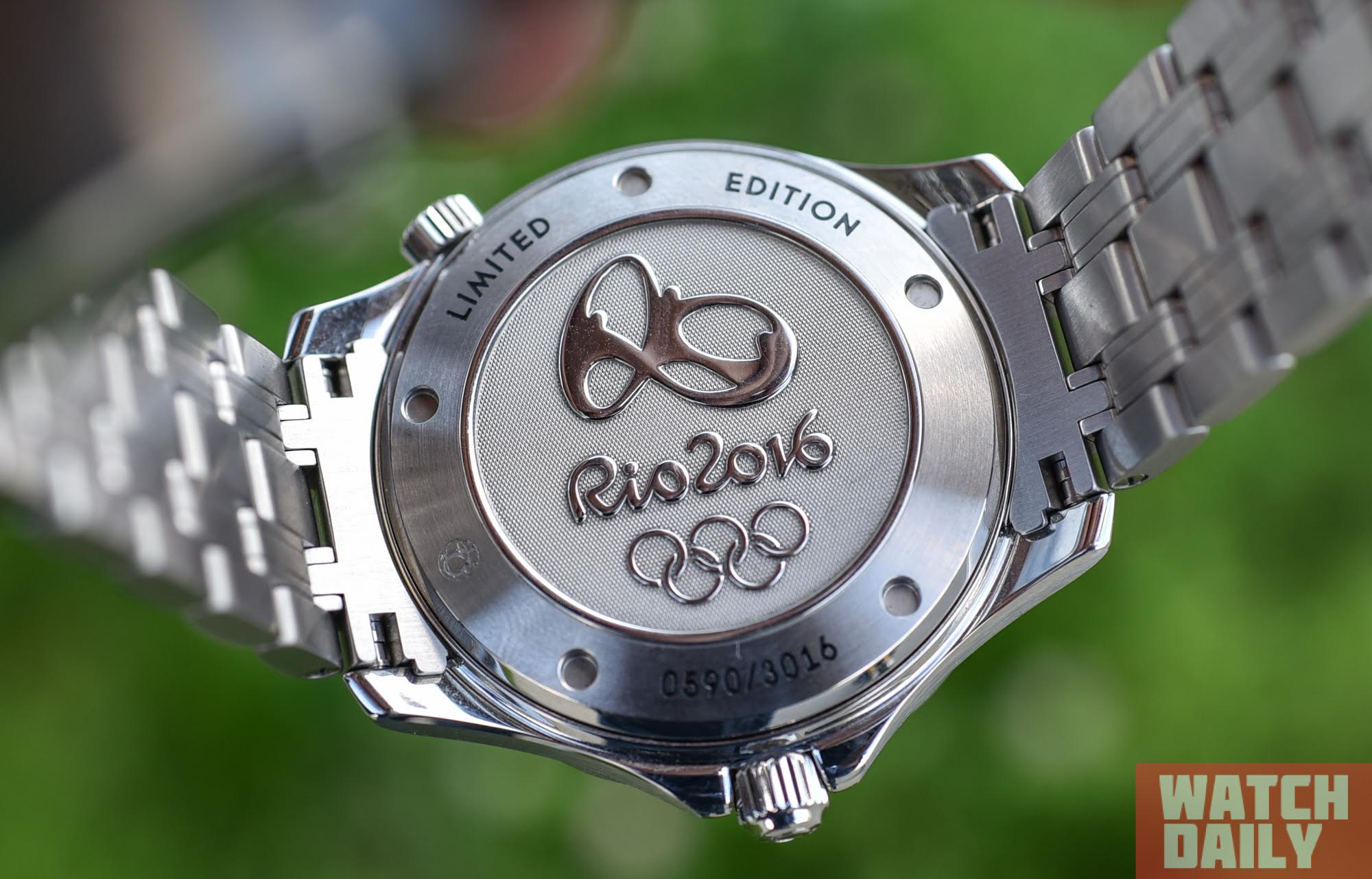 Разумеется, глухая задняя крышка корпуса, по аналогии с рассмотренными ранее моделями (Seamaster Bullhead «Rio 2016» и Speedmaster Mark II «Rio 2016»), располагает гравированным изображением эмблемы летней Олимпиады 2016 года, а также порядковым номером изделия в составе ограниченной серии в формате ХХХХ/3016.