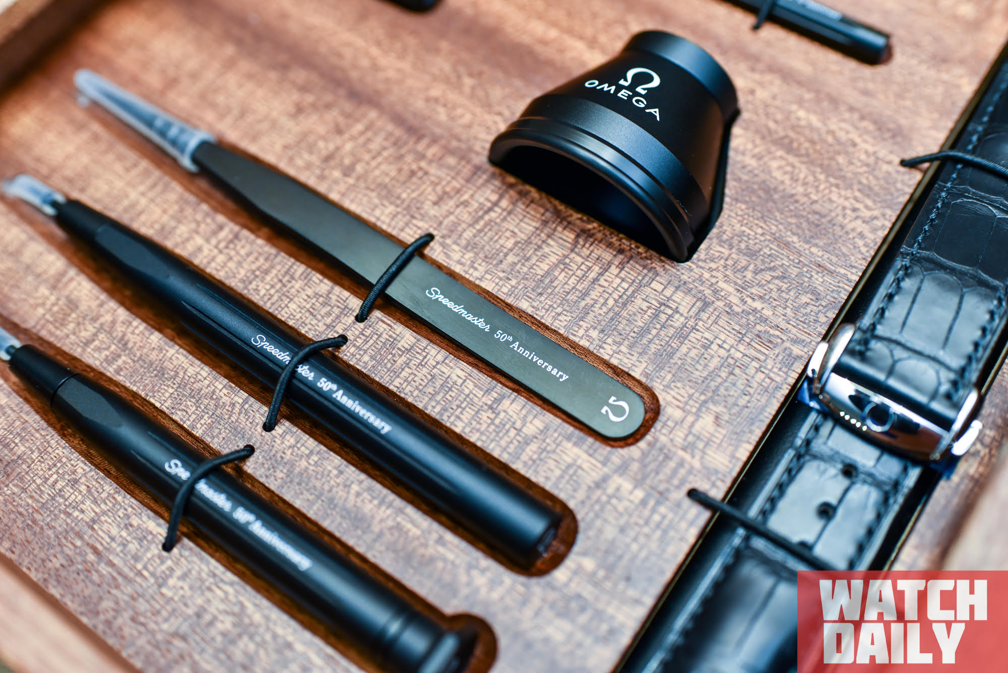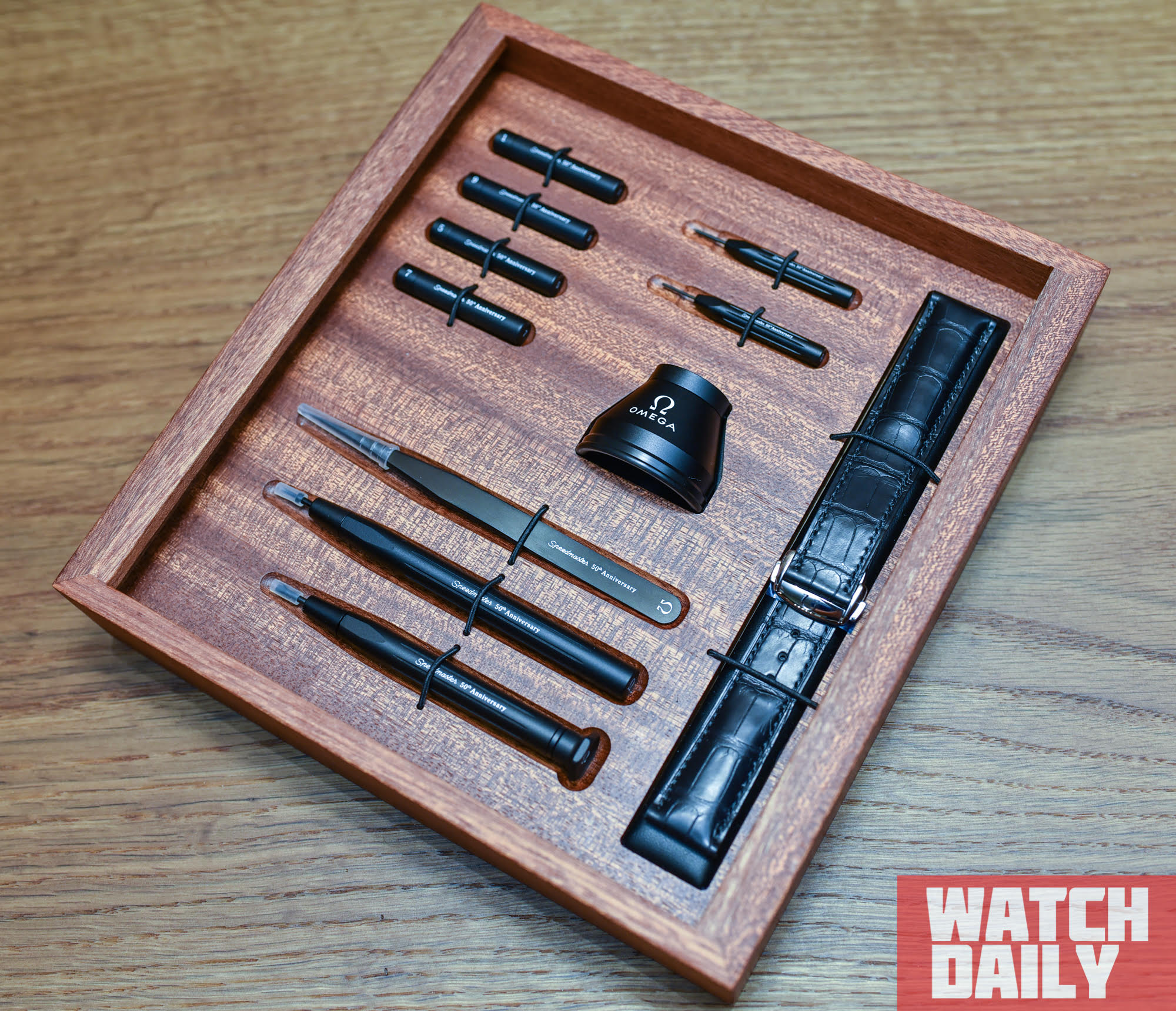 Внутреннее содержимое, помимо отсека с часами, предлагает дополнительный трей с интересной и богатой начинкой, которая включает: черный ремень из кожи аллигатора с раскладной застежкой, пинцет, часовую лупу в форме шаттла Apollo, две отвертки, инструмент для смены ремня/браслета, а также мини-пеналы со шпильками разной длины и сменными рабочими элементами для инструментов.