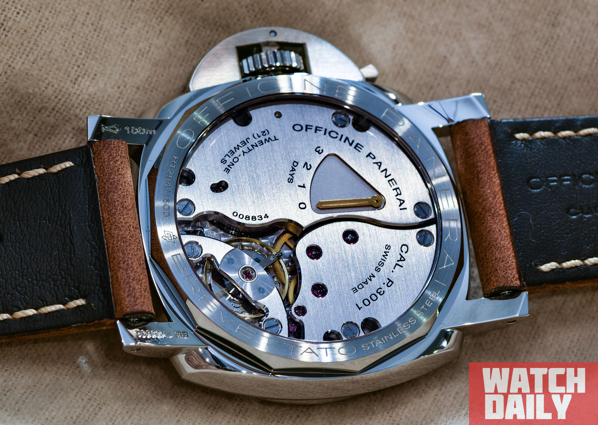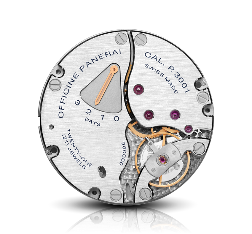 Механизм демонстрирует узнаваемый для Officine Panerai стиль декорирования, где преобладает плоская параллельная шлифовка (сатинирование) мостов и определенный визуальный акцент сделан на полировке их фасок.