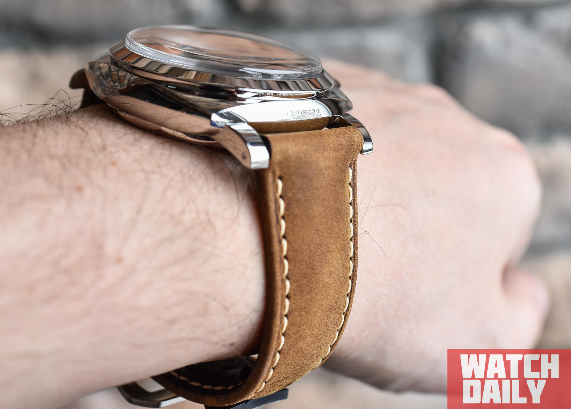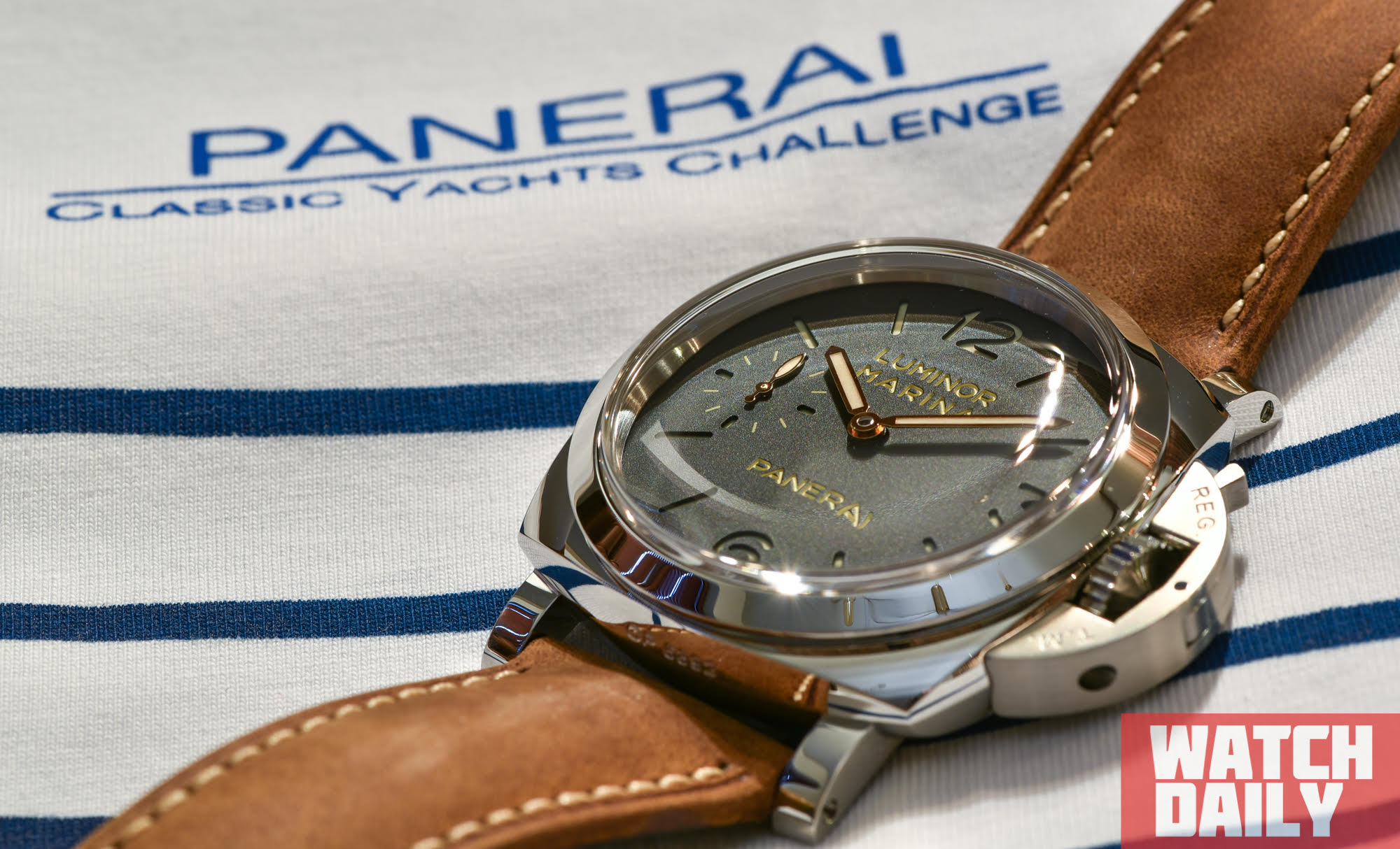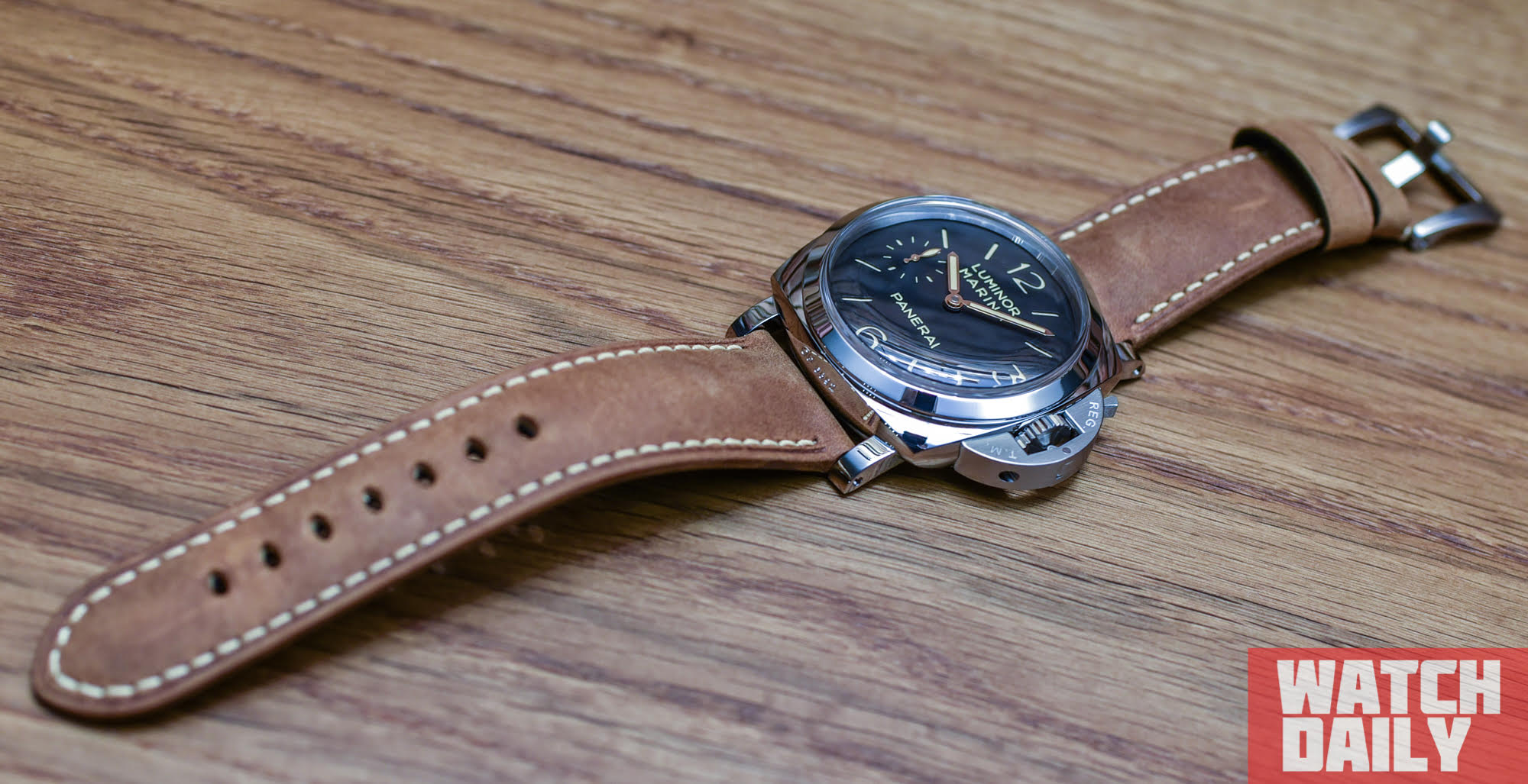 Завершает образ изделия широкий светло-коричневый ремень из телячьей кожи приятной фактуры, простроченный вручную бежевой нитью, дополнением к которому выступает узнаваемая массивная стальная застежка с логотипом Panerai.